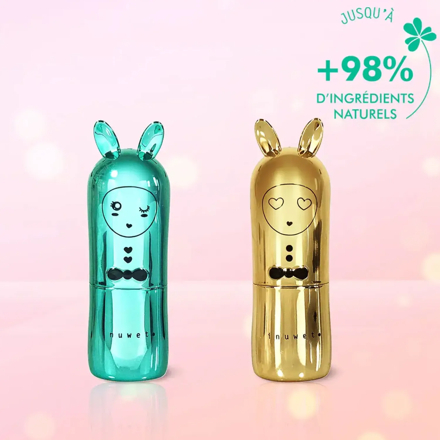En fugtgivende kanin læbepomade til børn i luksusversion med turquise metal fra franske Inuwet, udelukkende med naturlige ingredienser. Let perlemorsskær ved påføring, farveløs. Duft af dejlig cupcake og emballage formet som en sød kanin. Velegnet til børn fra 3 år.