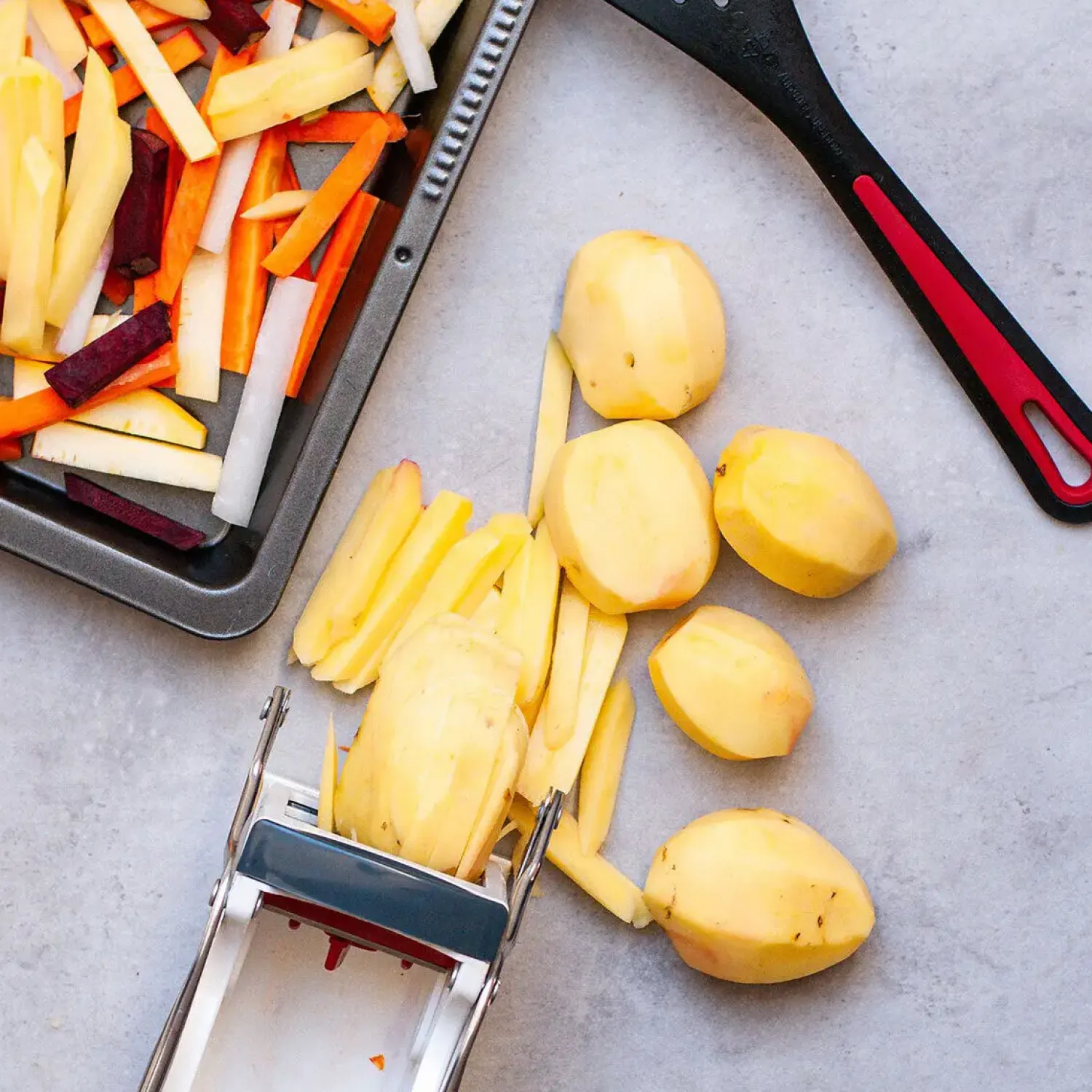 - Skærer kartofler, frugt og grøntsager