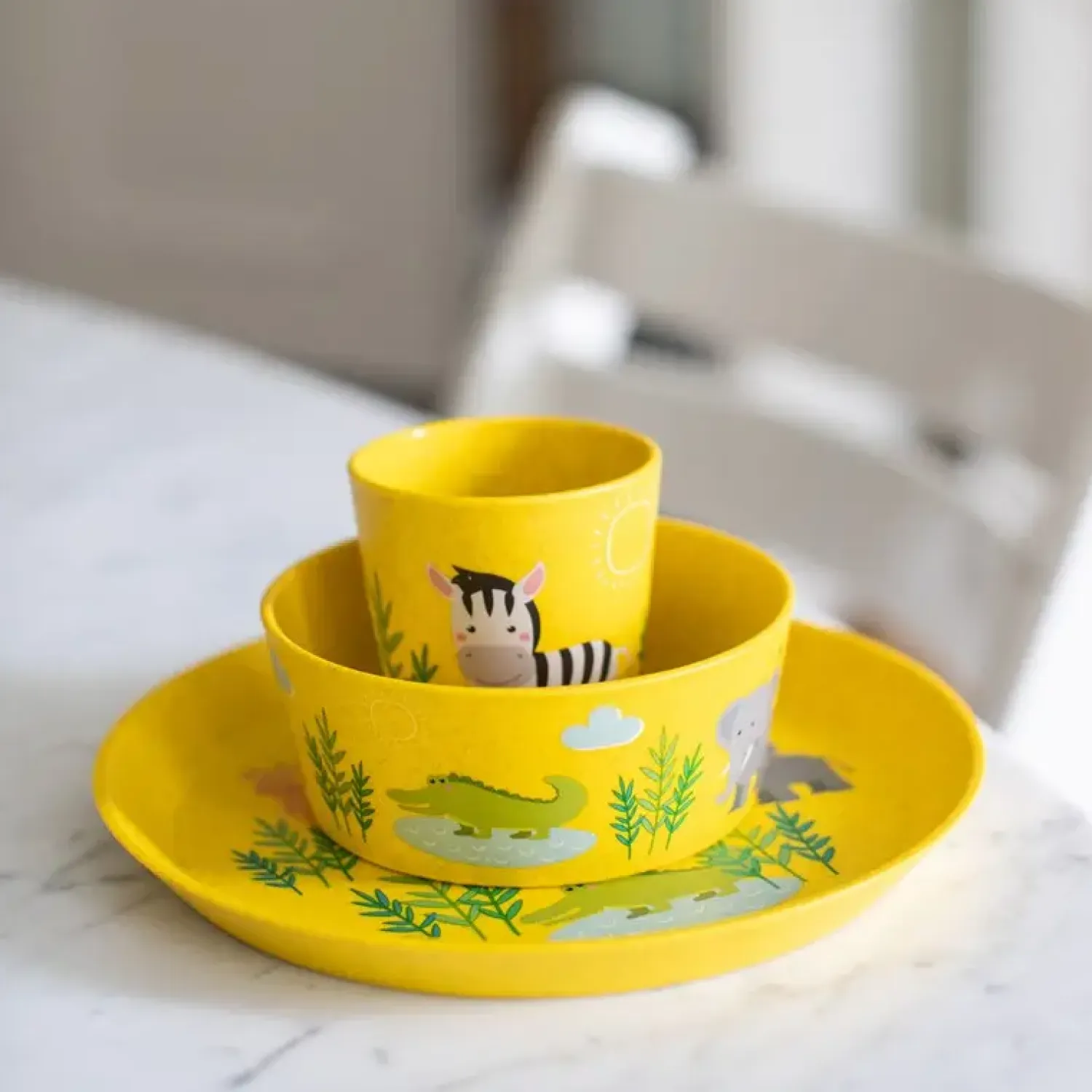 Spisesættet består af en kop, tallerken og skål med det sødeste Afrika-motiv. Den lille tallerken med de høje kanter gør det nemmere for barnet at få fat i maden og sørger samtidig for, at maden ikke spildes ud på bordet. Den lille skål er perfekt til en lille formiddags- eller eftermiddagssnack. Koppen er designet, så den er nem at holde for de små hænder. KIDS SET AFRICA er fremstillet i et robust materiale, så det ikke går i stykker, hvis det ryger en tur på gulvet.