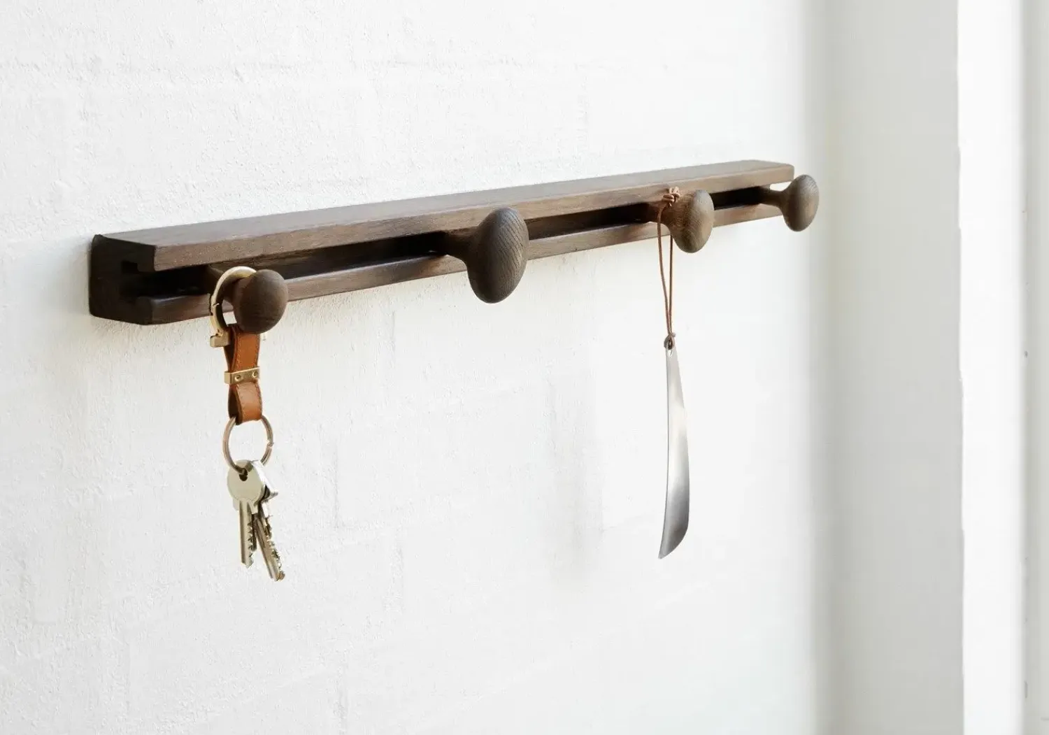 Denne knagerække i røget eg giver dig frihed til at indrette præcis efter dine behov. De fire runde knager kan justeres frem og tilbage på den 60 cm lange skinne, så du får den optimale afstand mellem dine jakker og tasker.