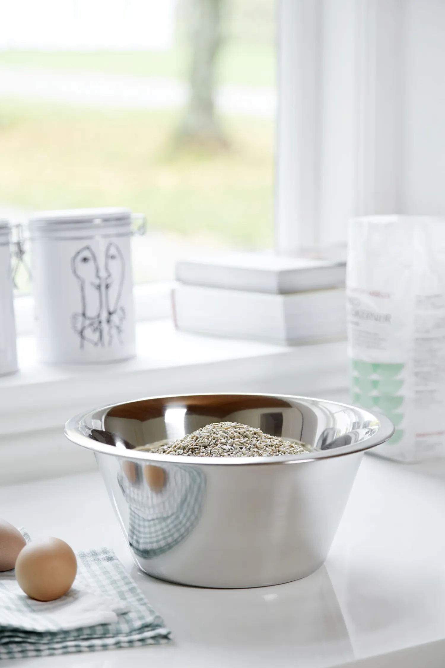 En rummelig køkkenskål i blankpoleret rustfrit stål med en kapacitet på 2,5 liter. Den blanke overflade gør rengøringen nem og hurtig, mens materialet sikrer lang holdbarhed i dit køkken.
