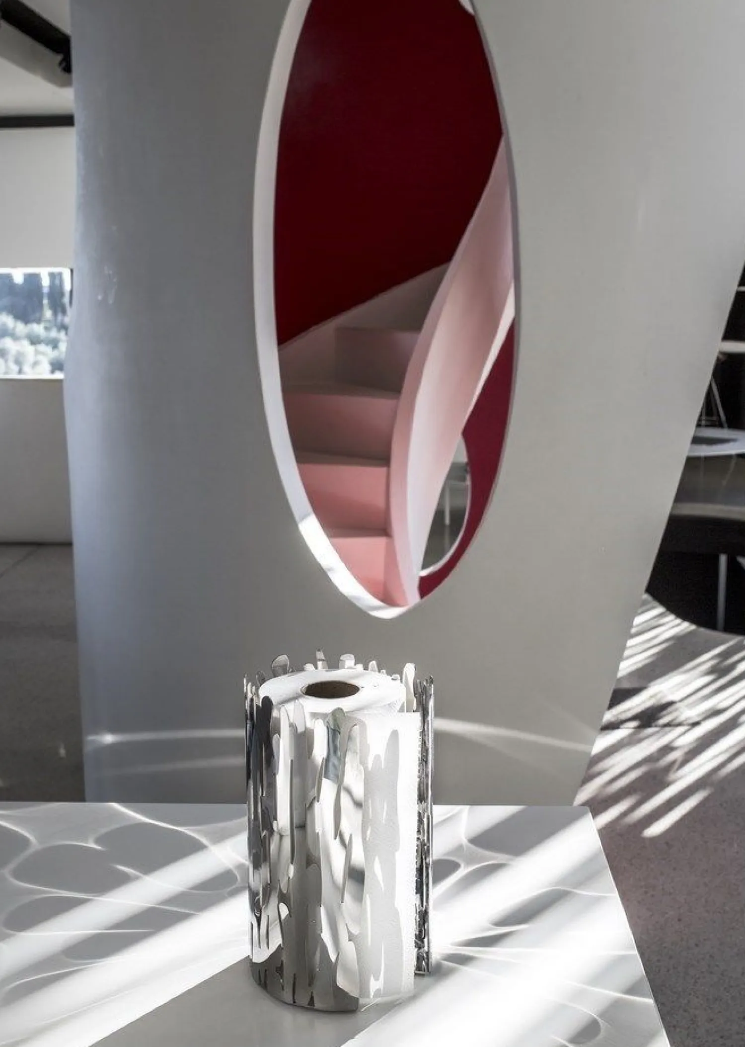 Denne køkkenrulleholder fra Alessi kombinerer holdbart 18/10 rustfrit stål med et særpræget, abstrakt udskæringsmønster. Den er fremstillet på fabrikken i Crusinallo, Omegna, hvor laserperforering sikrer præcise detaljer i det sorte design.