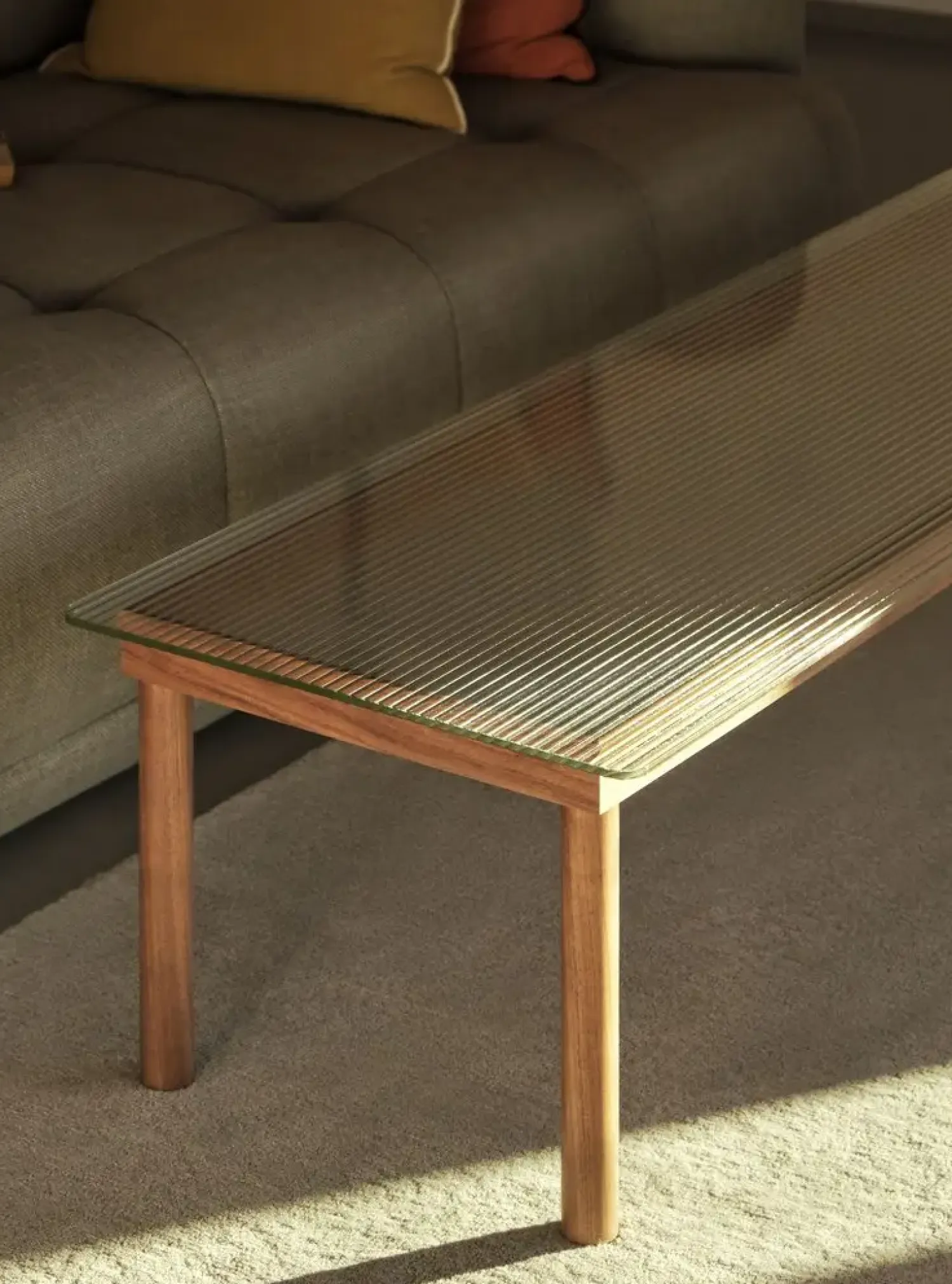 Dette sofabord fra HAY kombinerer funktionalitet med ansvarlig produktion. Basen er fremstillet af FSC-certificeret eg, hvilket understøtter bæredygtig skovdrift. Bordpladen i forstærket glas tilbyder holdbarhed, mens den rillede tekstur giver en karakteristisk overflade. Det måler 140 cm i længden, 50 cm i bredden og 36 cm i højden.