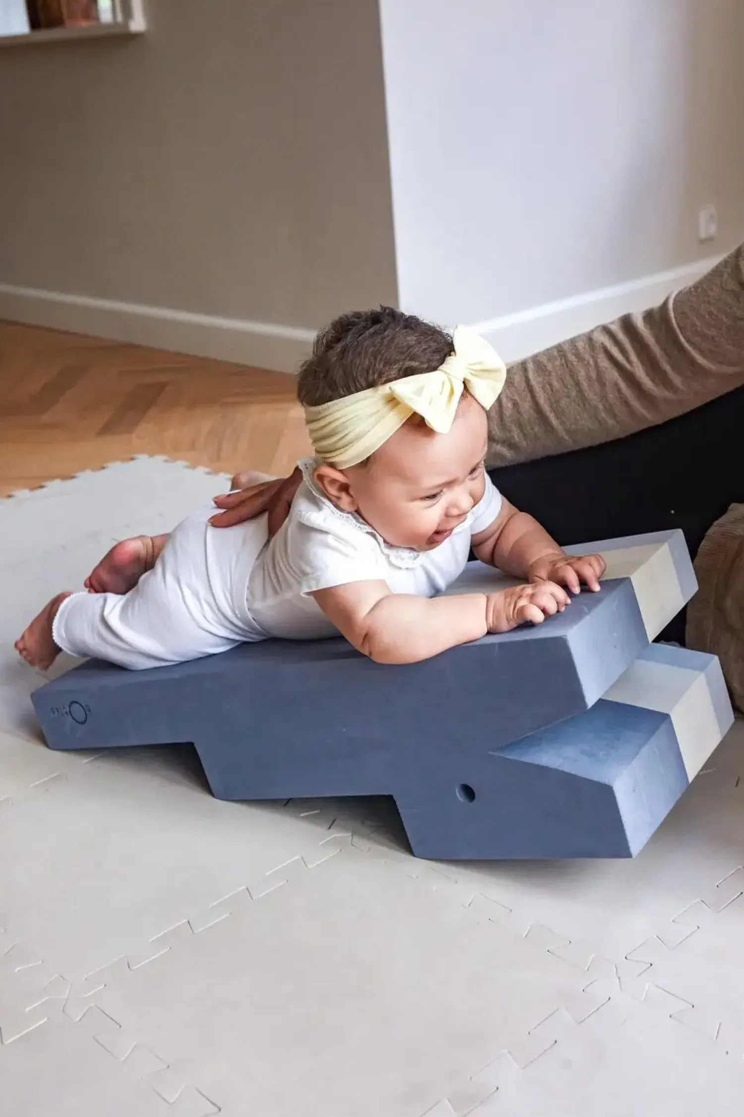 Denne krokodilleformede legemøbel fra bObles kombinerer aktiv leg med praktisk funktionalitet. Den skyblå farve med hvide striber giver et stiliseret design, der passer naturligt ind i børneværelset. Produktet er lavet af 60 % blå materiale og fungerer både som legetøj til motorisk udvikling og som en funktionel genstand.