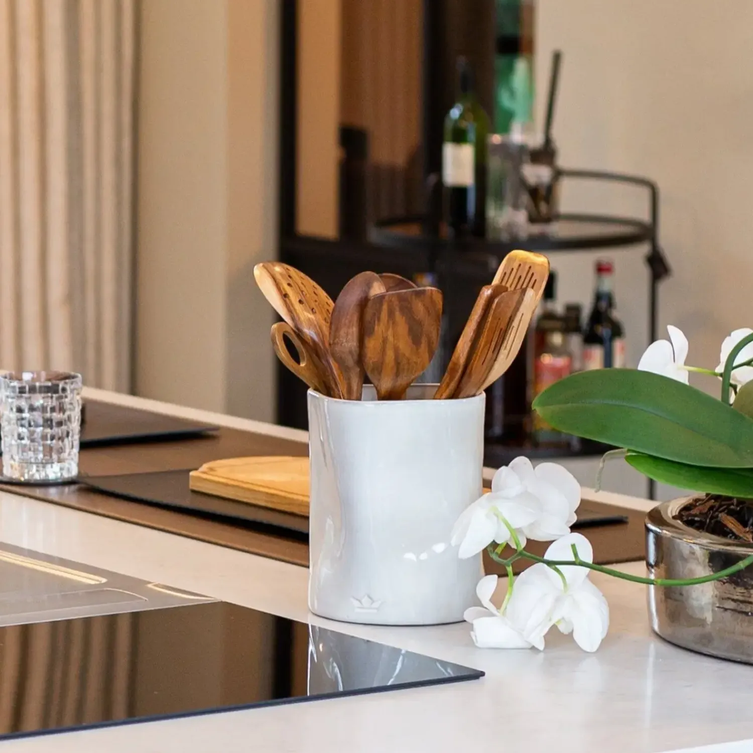 Dutchdeluxes redefinerer keramisk udseende med dette stilfulde, robuste og bulede design. Ryd op på din køkkenbordplade og forvandl de ufrivillige redskaber til en buket af praktiske ting. Fås i 3 sofistikerede farver: Sort mat, hvid og platin. Lavet af naturlig keramik. Håndlavet: Hvert stykke er unikt og kan variere en smule i form og farve. Brandhærdet ved 1100 °C. Tåler opvaskemaskine. Multifunktionel og nem at rengøre.