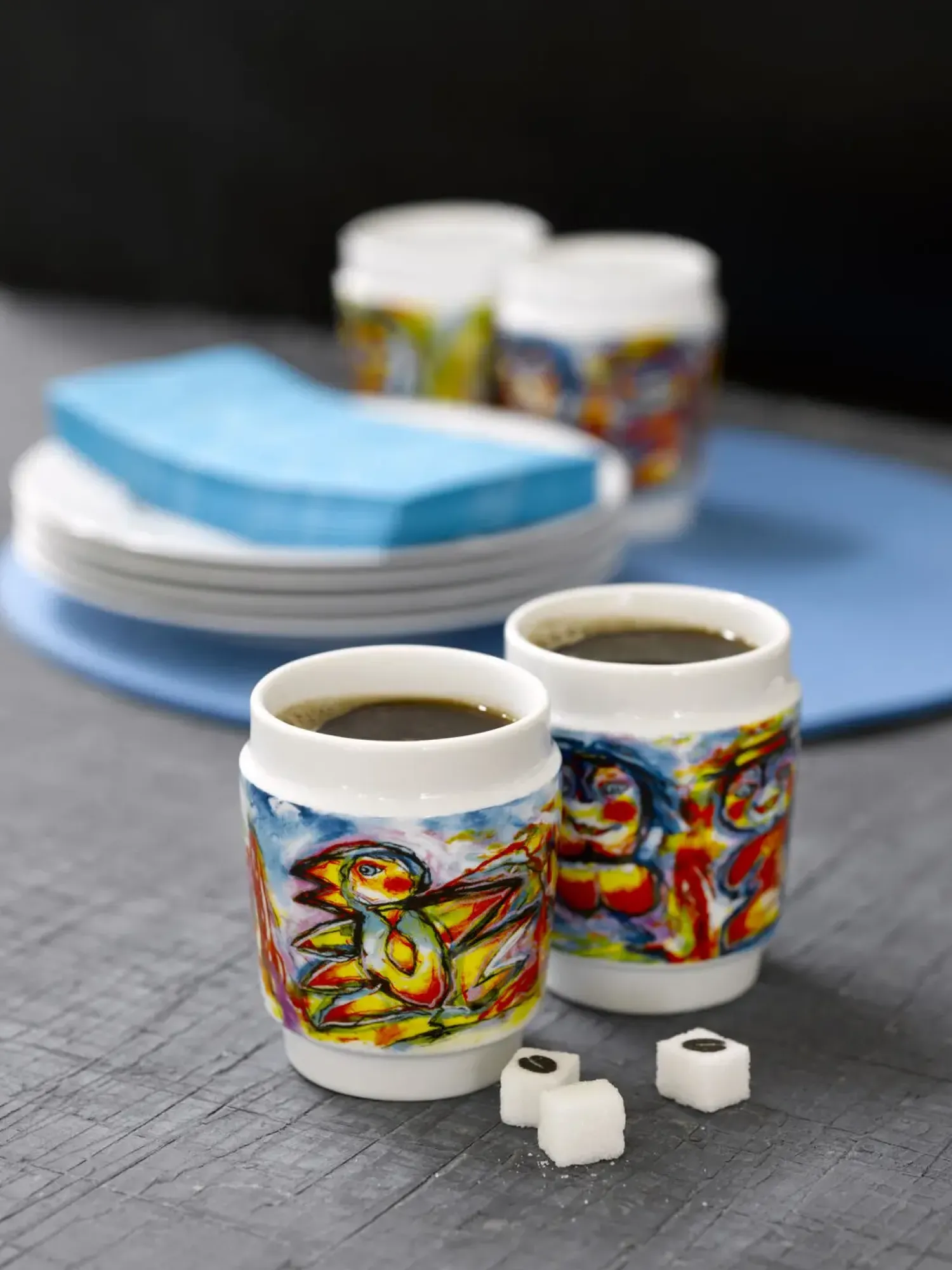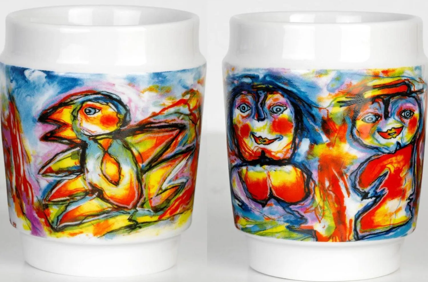 Disse porcelænskopper med dobbeltvægskonstruktion holder din kaffe eller te varm længere, mens ydersiden forbliver behagelig at holde på. Det farverige Happy Bird-motiv gør hver kop til et lille kunstværk på dit bord.