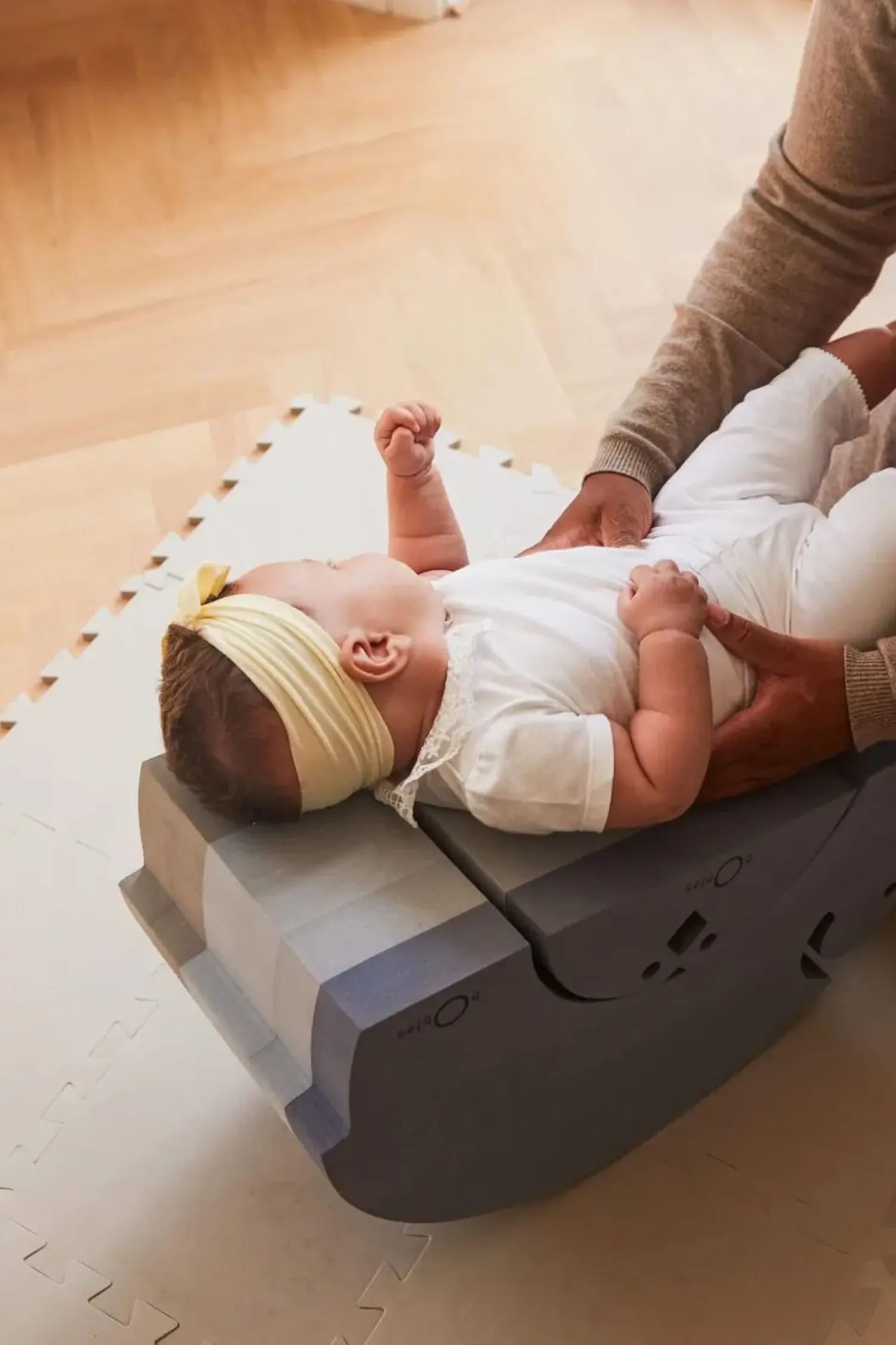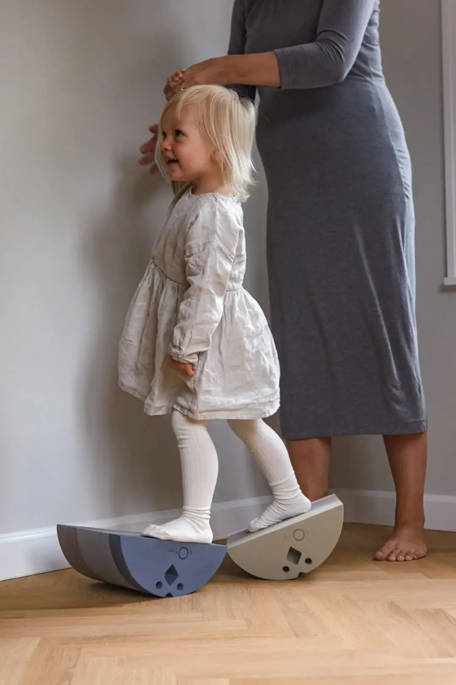 Den buede form kræver, at dit barn konstant justerer sin kropsholdning, hvilket naturligt styrker nakke- og rygmusklerne. Både siddende og stående øvelser er mulige, så produktet vokser med dit barns færdigheder. De naturlige, tidløse farver i blå og grå nuancer passer ind i de fleste børneværelser.