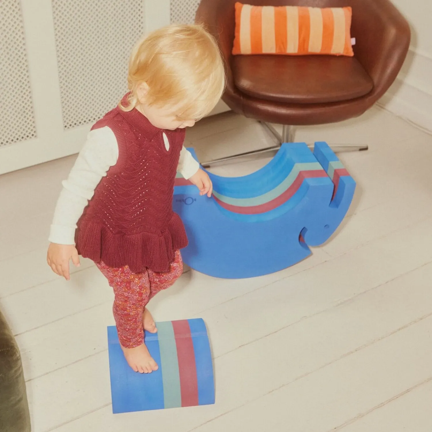 Kyllings buede overflade kan bruges som sliske, når baby skal styrke nakke og ryg. Den passer ind i maven på den store bObles Elefant, og sammen kan de bruges som en vippe, der styrker vestibulærsansen. Når barnet rammer tumlingealderen og begynder at sidde selv er Kylling fantastisk til at øve det kontrollerede vip. Tumlingen kan sidde på Kylling og vippe frem og tilbage eller fra side til side med begge fødder i gulvet. Når barnet er blevet sikker på benene kan bObles Kylling bruges til at vippe stående. Prøv også på kun et ben! Forældrene kan også bruge Kyllingen til at balancere på, f.eks. mens de laver mad eller ser TV. Balancen bør udfordres hele livet! Farverne i vores nye bObles Gym finder inspiration i den energi og bevægelsesfrihed børnene oplever i gymnastiksalen. Produkterne er designet til sjove og stimulerende aktiviteter, så forældre kan skabe en legende og aktiv atmosfære indendørs. Sæt energien fri i hjemmet med vores nye farvepalet for efterår/vinter 23/24. Lad aldrig et øjeblik med regn, vind eller begrænset plads sætte en stopper for din evne til at bevæge og udvikle dig. Med bObles starter eventyret i hjemmet. Press play på legen!