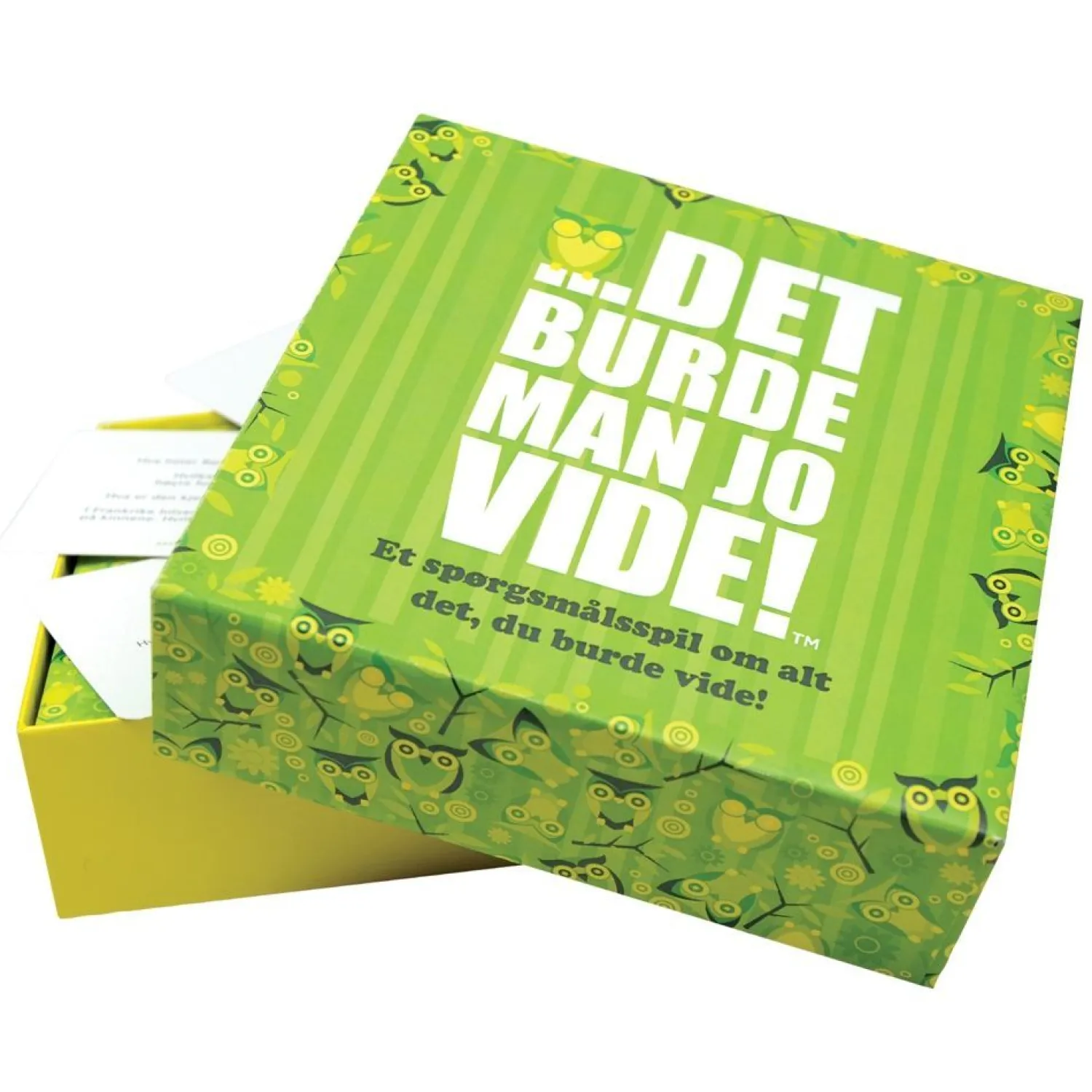 Det burde man jo vide! er et særdeles medrivende og dybt underholdende spørgsmålsspil, der rummer over 400 spørgsmål. Disse omhandler emner og facts, som du burde have styr på, og du får derfor ikke point for de rigtige svar – men udelukkende minuspoint for dine forkerte svar!