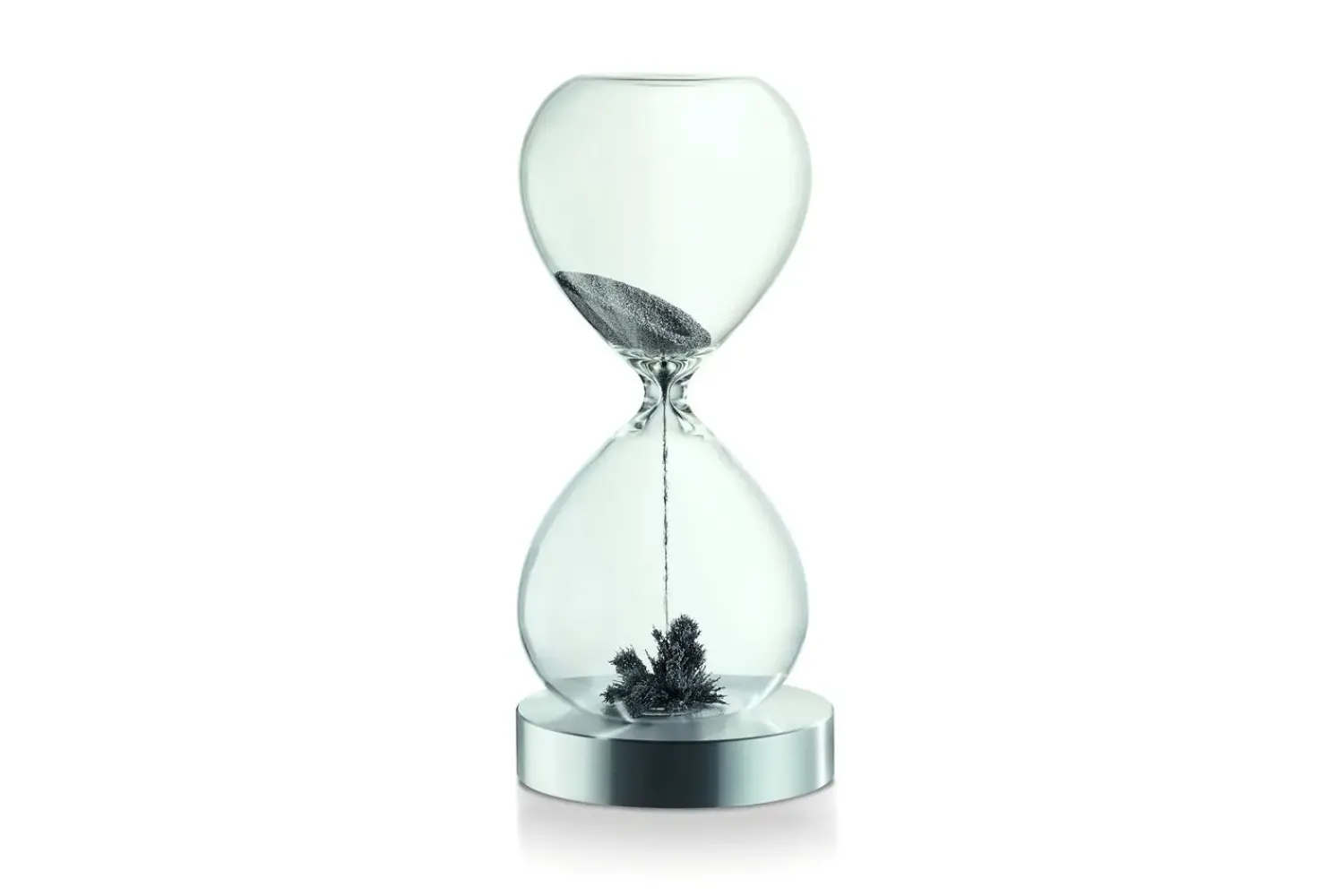 Tidsmåleren består af en transparent krop af holdbart borosilikatglas på en solid aluminiumsbase. Det magnetiske ferritsand flyder mellem kamrene, hvilket skaber et fascinerende visuelt element. Den slanke silhuet på 16 cm i højden gør den til et iøjnefaldende, men ikke dominerende element i ethvert rum.