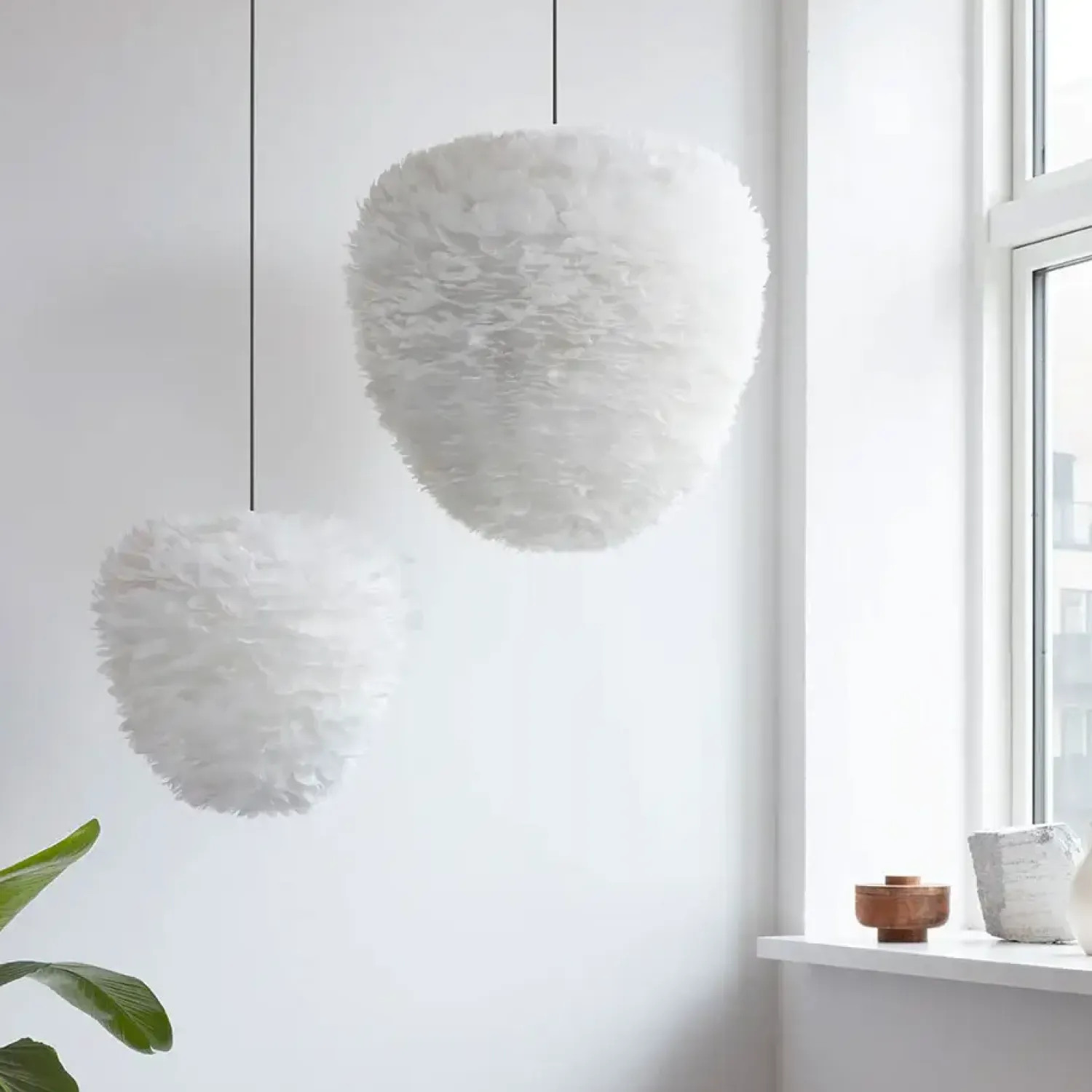 Eos lampen er produceret af gåsefjer, der er blevet tilovers ved slagtning til fødevareindustrien. Gæssene er slagtet i overensstemmelse med EU-regulativer. Fjerene vaskes, koges, tørres og behandles inden de bliver brugt til at lave de flotte Eos lamper.