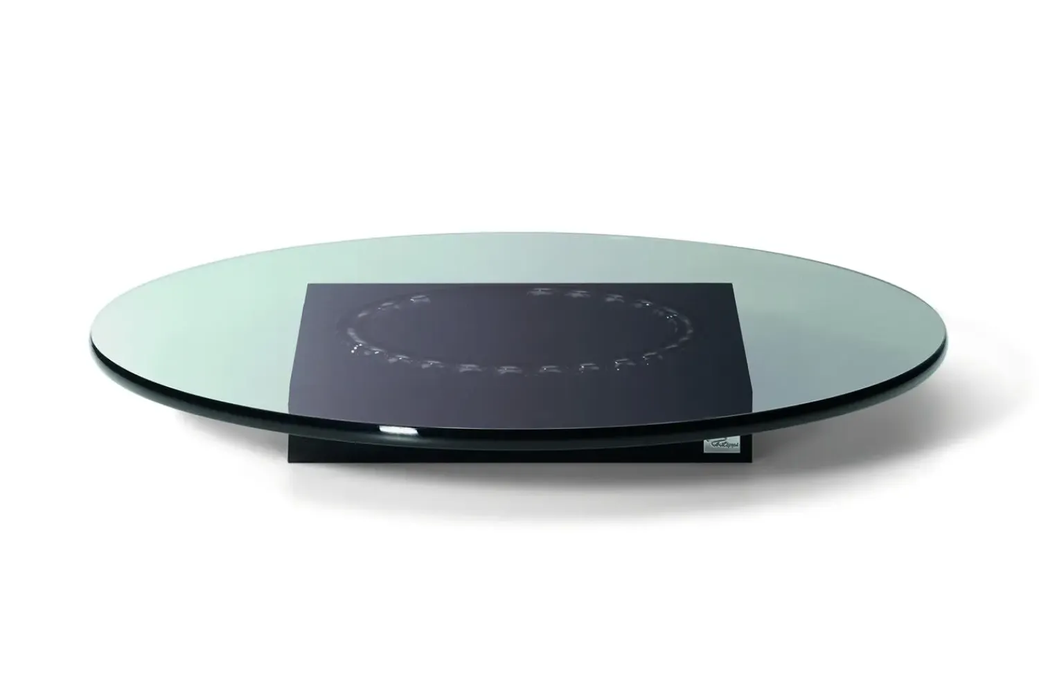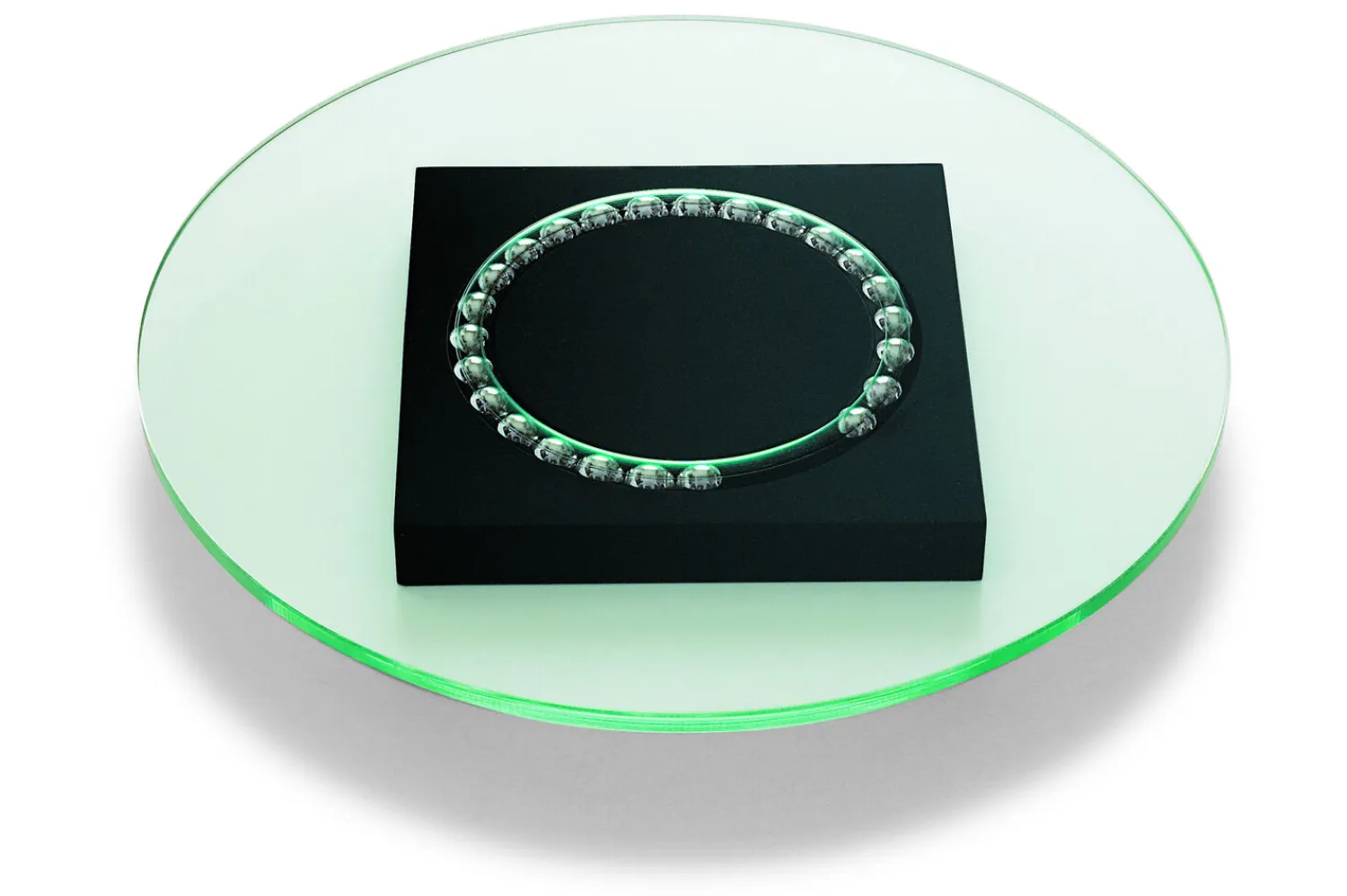 Drejepladen består af en rund glasplade med en glat overflade, monteret på en firkantet sort base. Rustfrie stålkugler er arrangeret i en cirkel i basen, hvilket muliggør rotationsbevægelsen af toppladen. Denne konstruktion giver pladen dens karakteristiske drejefunktion. Produktet er desuden udstyret med et IP44-certificeret kabel, som specifikt er designet til at yde beskyttelse mod faste genstande og vandsprøjt. IP44-certificeringen sikrer, at kablet er beskyttet mod indtrængen af faste genstande større end 1 mm og mod vandsprøjt fra alle retninger, hvilket gør det velegnet til forskellige miljøer, både indendørs og udendørs.