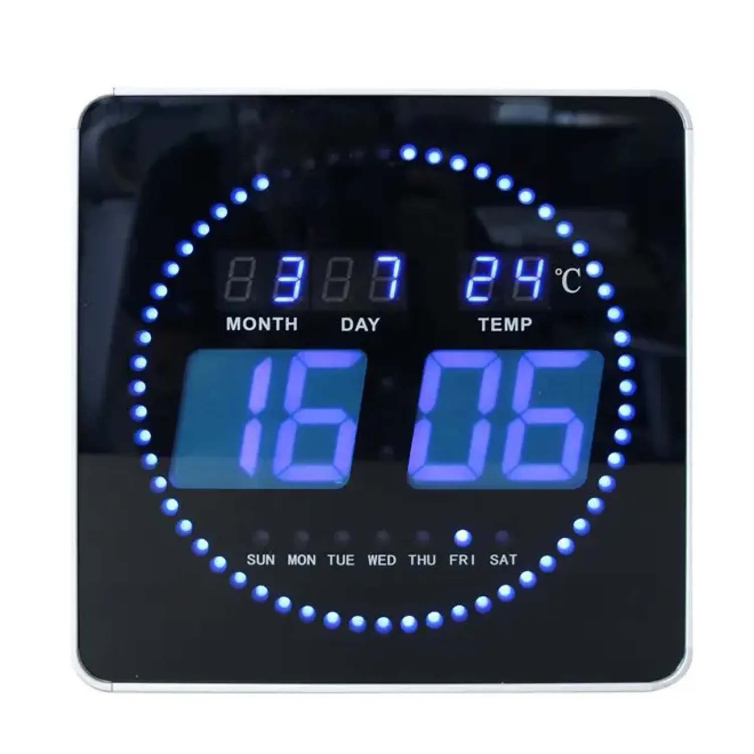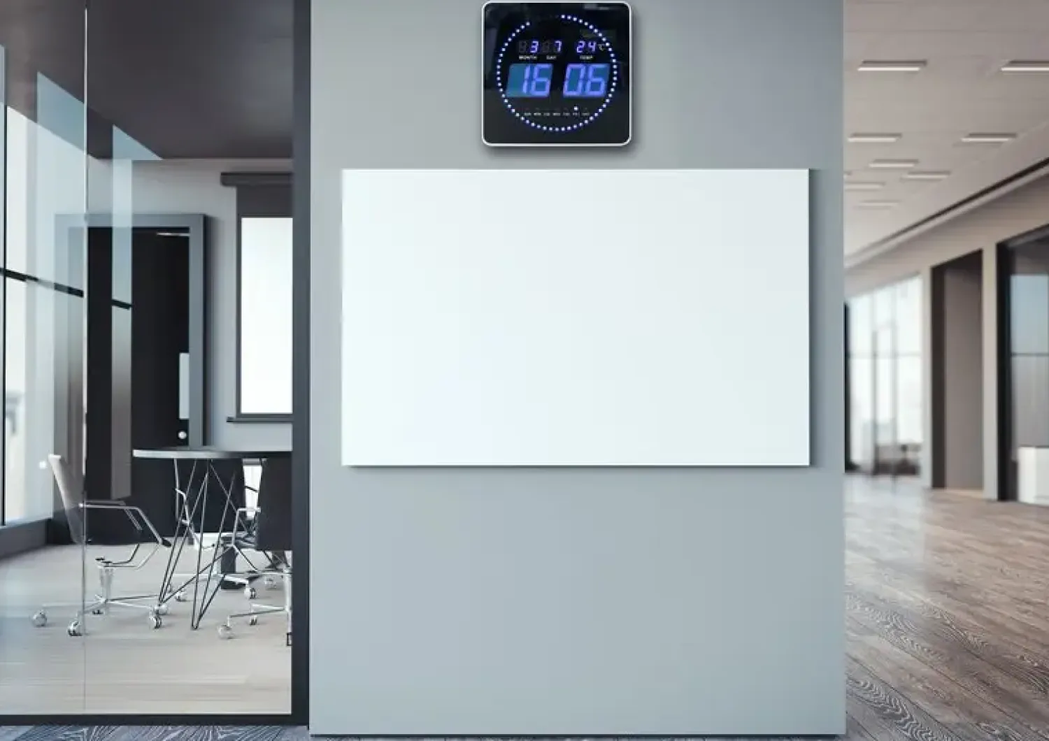 FLO er et stille LED-vægur, der giver dig oplysninger om klokkeslæt, dato og temperaturen på den omgivende luft. Takket være kontrasten ved de store digitale, blå og 6 cm høje LED-tal på sort baggrund er dette ur let at aflæse i store rum såsom receptioner eller mødelokaler.
