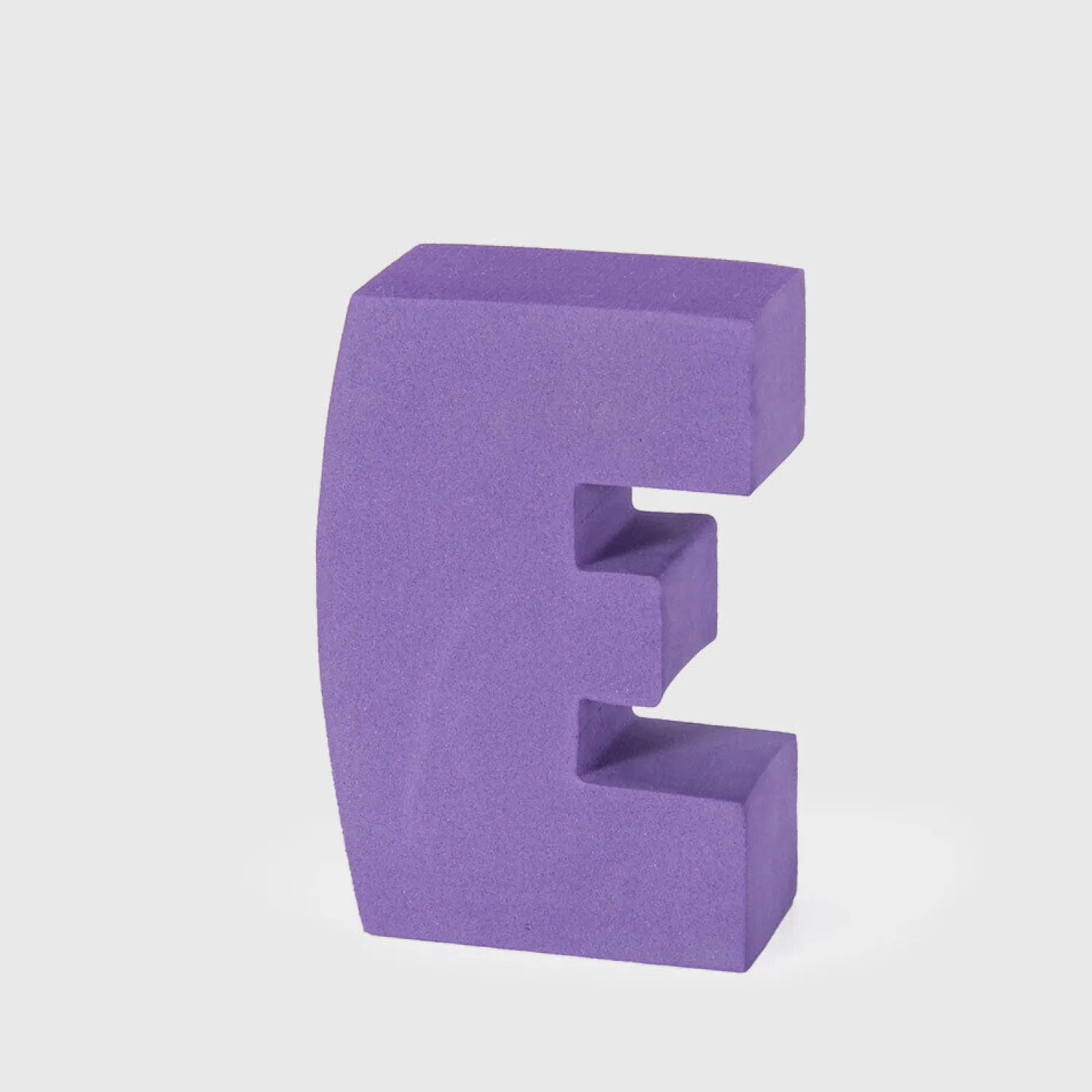 Dette bogstav E er formet som en solid blok i lilla og er en del af bObles alfabet. Den lilla farve markerer, at E er en vokal, mens konsonanterne i serien er blå. Denne farvekodning hjælper børn med at skelne mellem bogstavtyper under leg og læring.