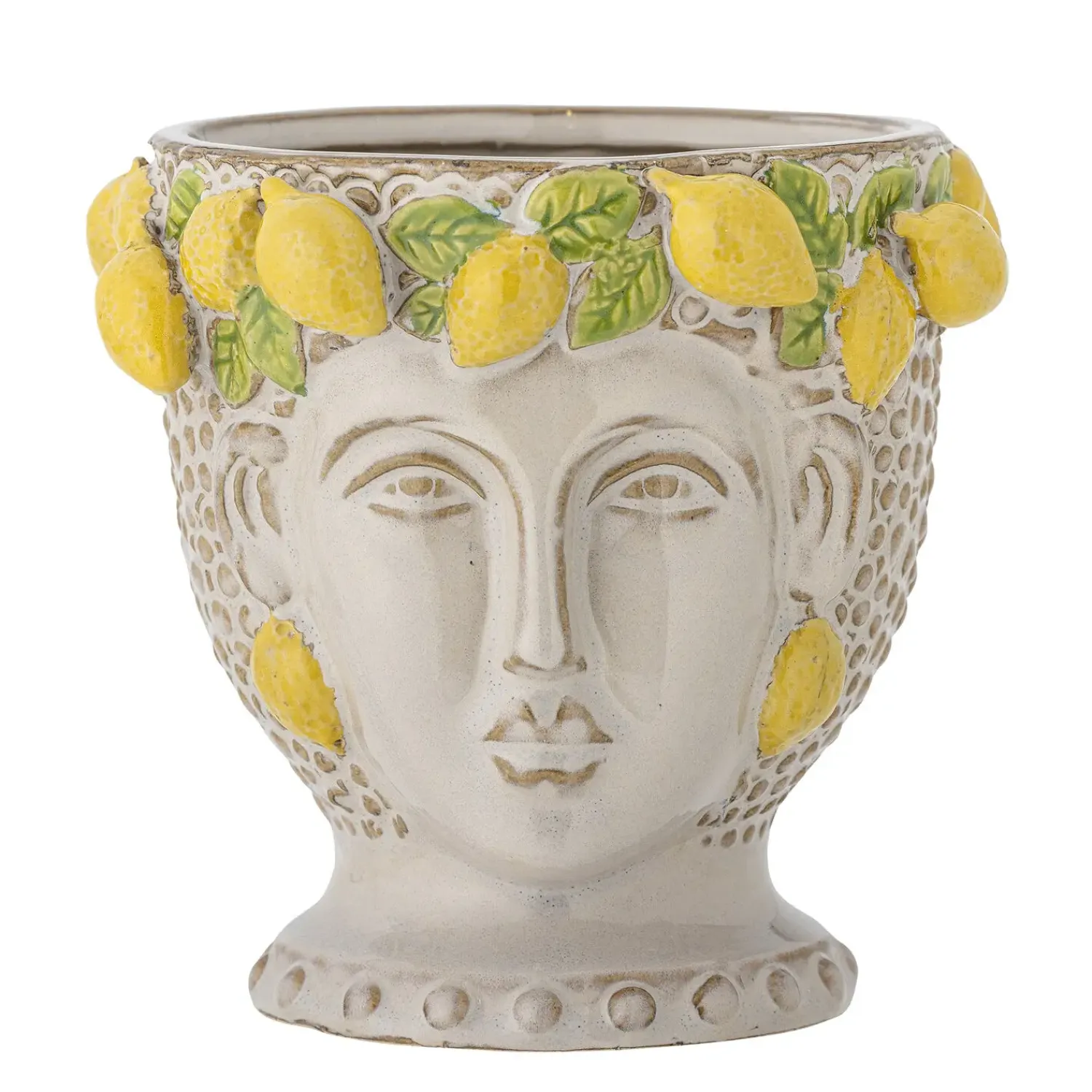 Creative Collection præsenterer en charmerende tilføjelse til dit hjem med Limone urtepotteskjuleren. Denne unikke potte i gul stentøj er formet som et kvindeansigt med en krone af citroner og blade, der tilfører et strejf af italiensk inspiration til din indretning. Delvist hånddekoreret inviterer denne urtepotteskjuler naturen indendørs og lader tankerne vandre til solrige italienske haver. Den kunstneriske udformning gør den til et iøjnefaldende element i enhver plantesamling.