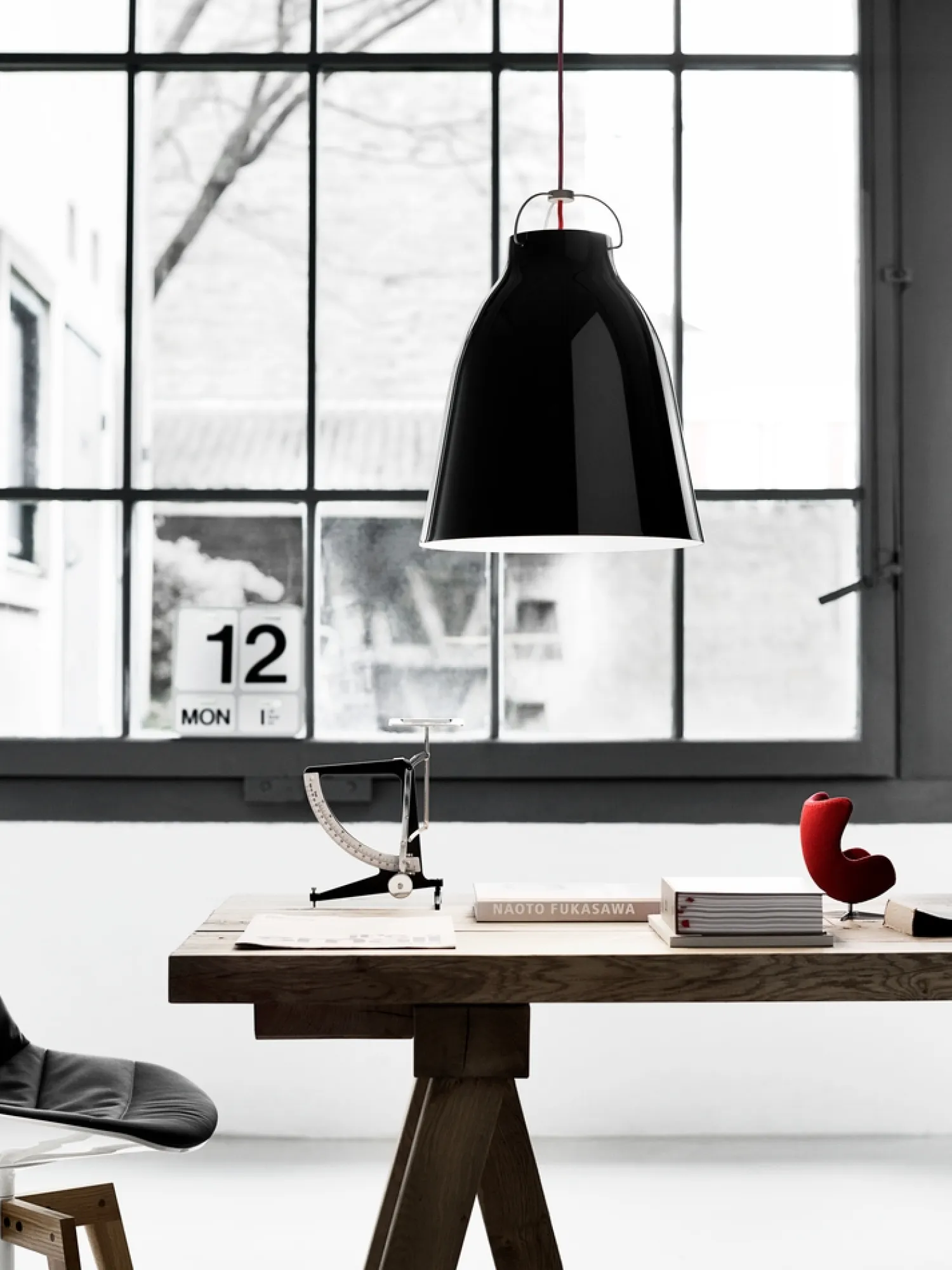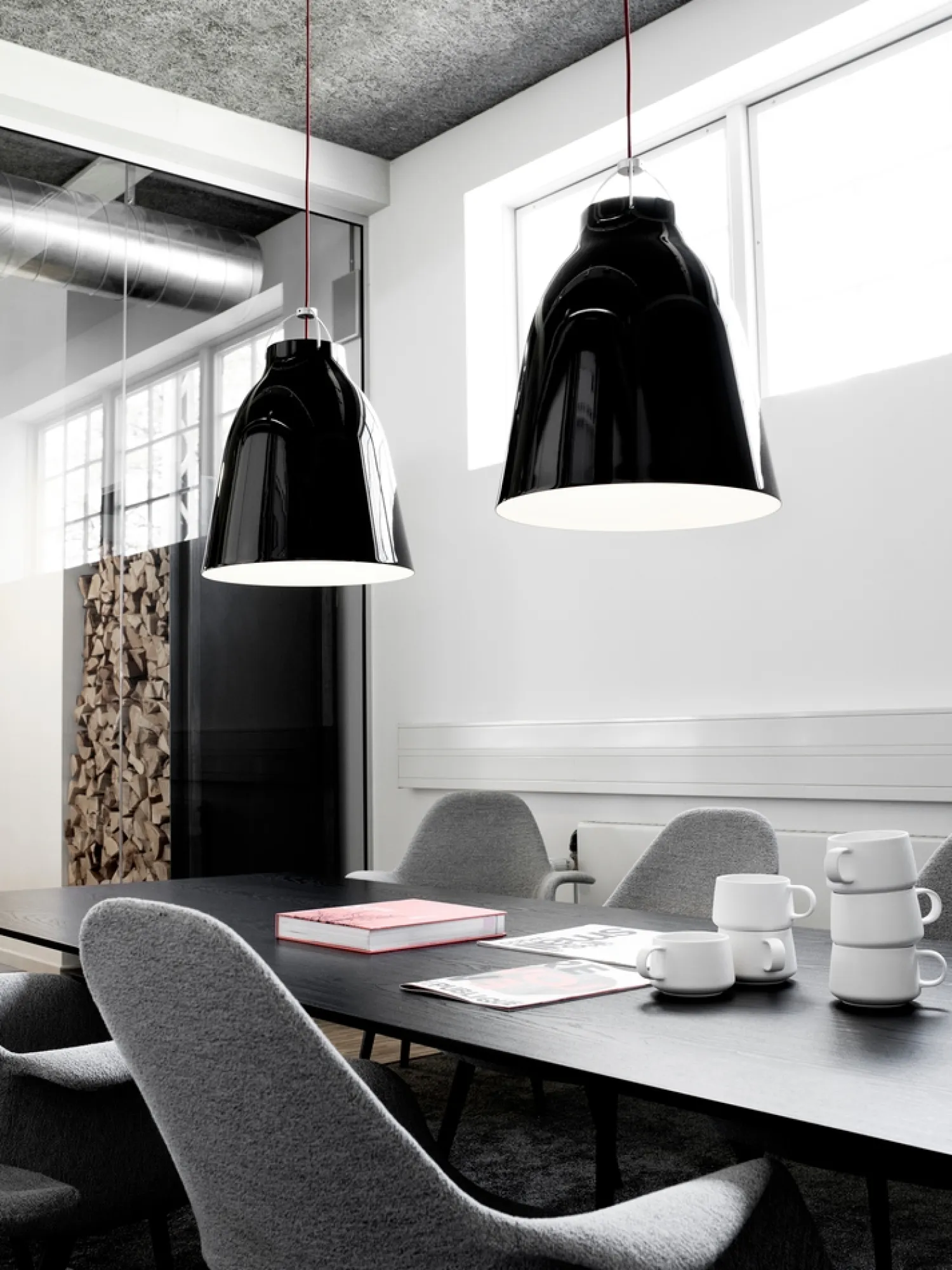 Caravaggio™ loftlampe fra Fritz Hansen er en moderne klassiker designet af Cecilie Manz. Med sin store buede P3-skærm og tidløse elegance passer den ideelt over spisebordet. Lampens sorte finish og 6 meter lange røde ledning tilføjer et stilfuldt præg til ethvert rum.