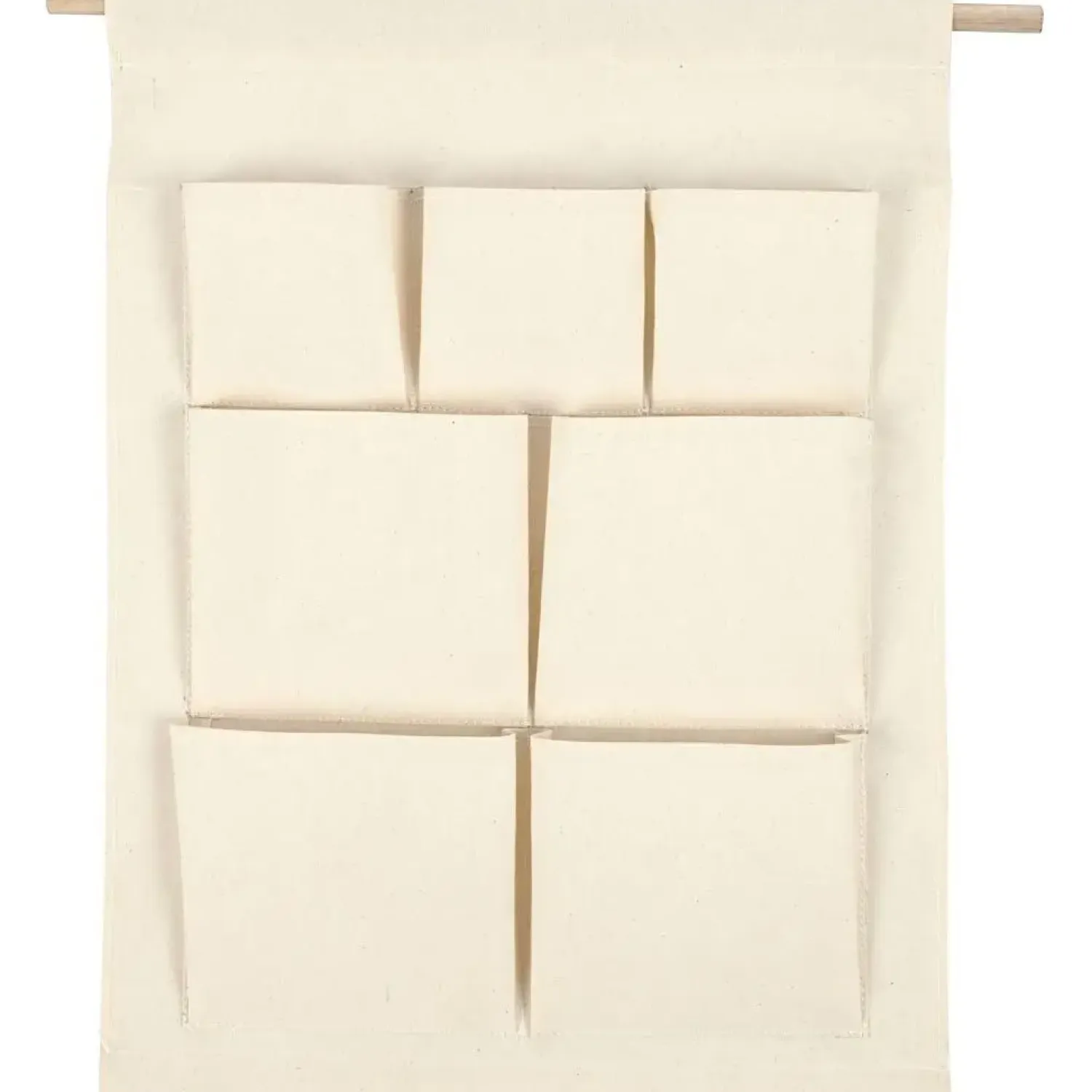 Praktisk vægophæng med 7 lommer, i kraftig kanvas med lommer og plastbelagt bagside, som giver ekstra stabilitet. Øverst er der en løbegang med rundpind i træ, så den nemt kan hænges op.