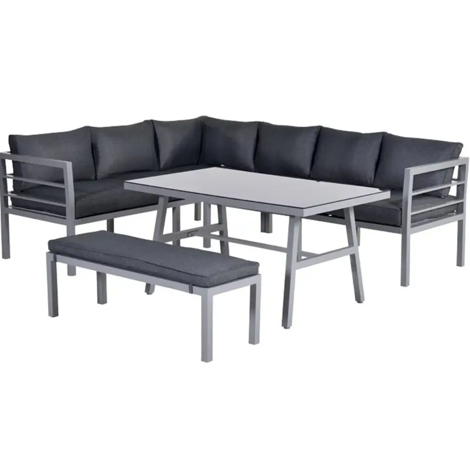 Dette loungesæt fra Garden Impressions er designet til at give dig det bedste fra begge verdener – afslapning og spisning. Sættet indeholder en hjørnesofa, et spisebord og en ekstra bænk, alle med matchende hynder. Rammen er lavet af aluminium med en hvid pulverlakering, og bordet har en glasplade af hærdet glas. Puderne er vandafvisende, hvilket betyder, at en kort regnbyge ikke er noget problem.