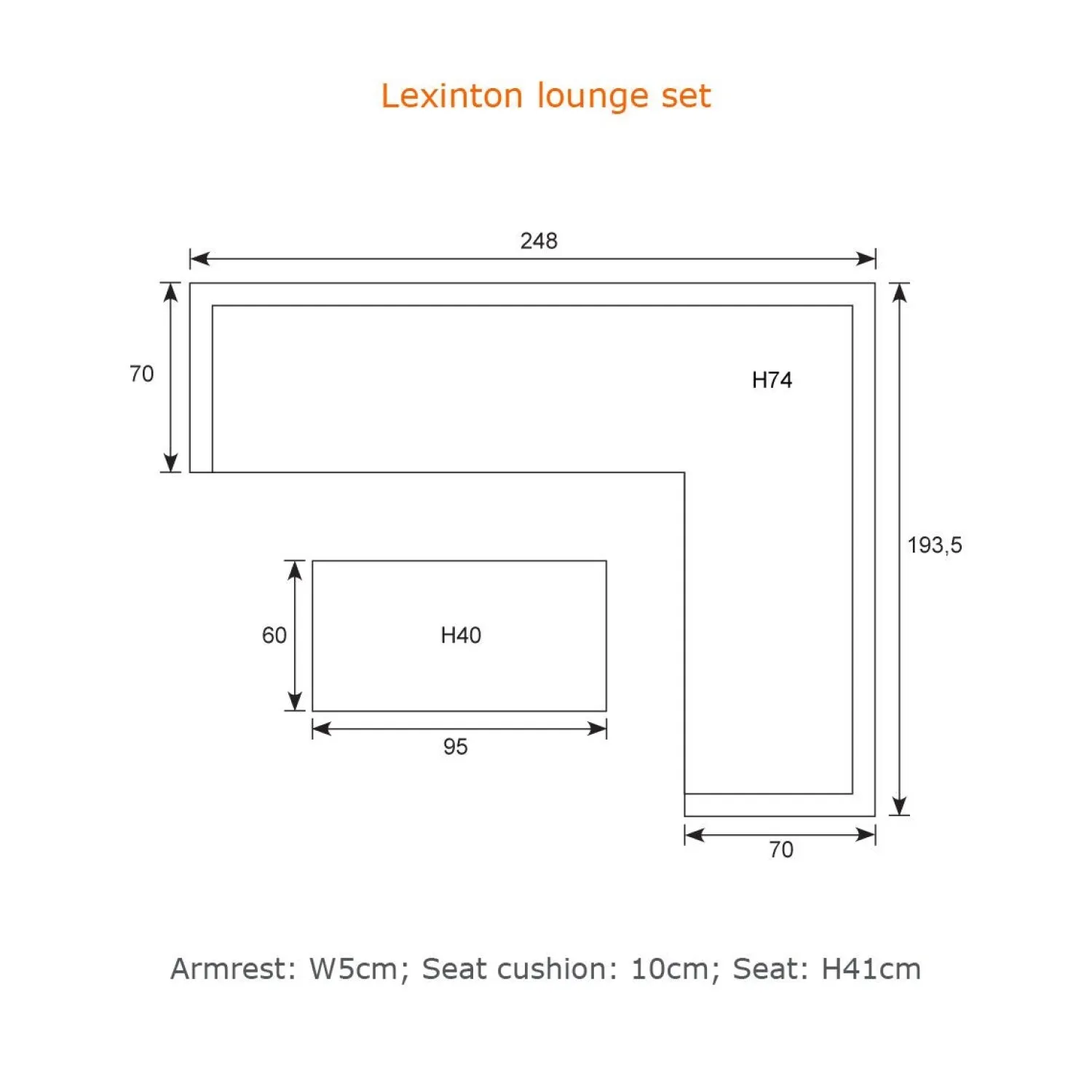 - Hjørnebænk: 248 x 193,5 x 74 cm