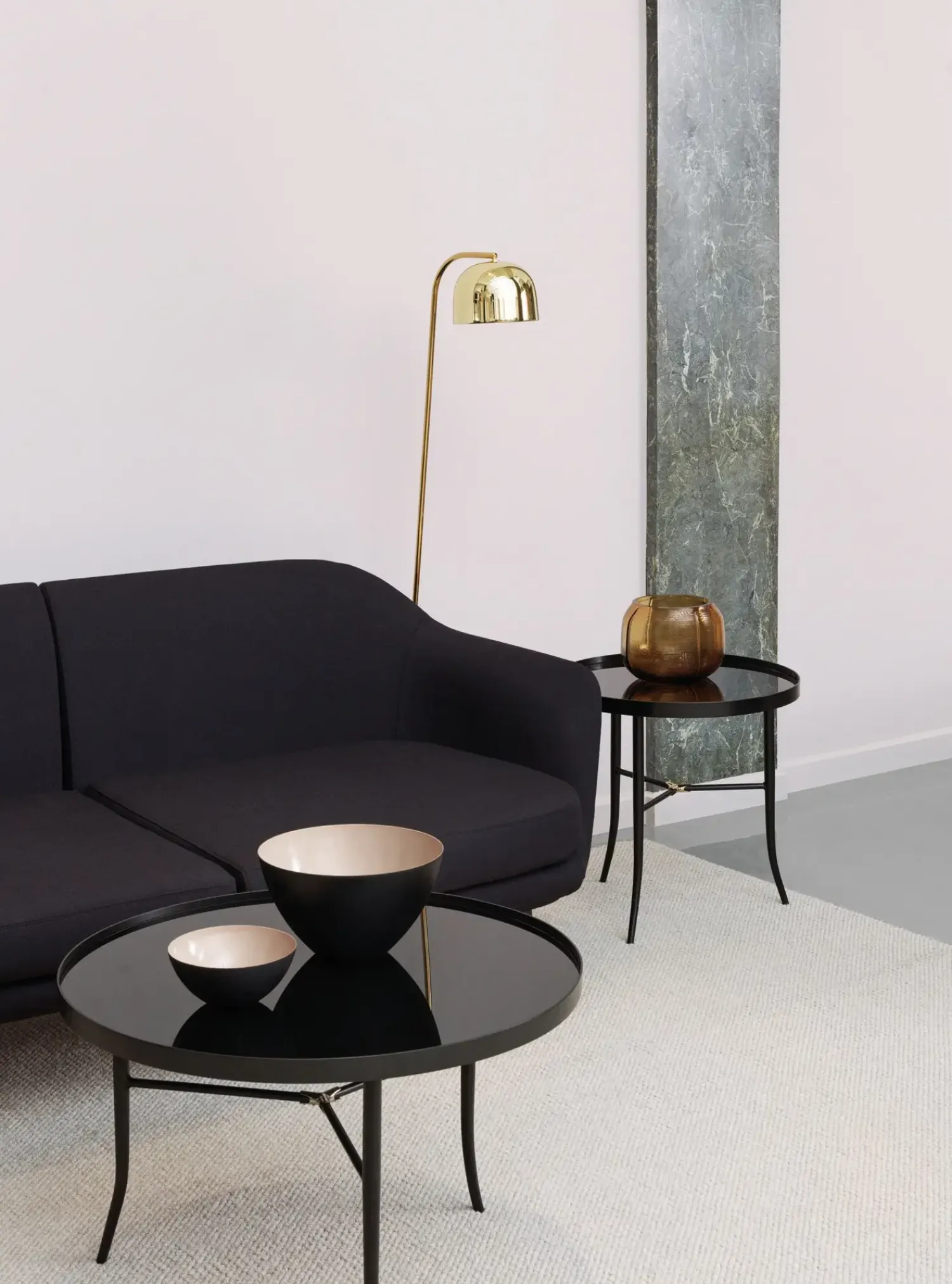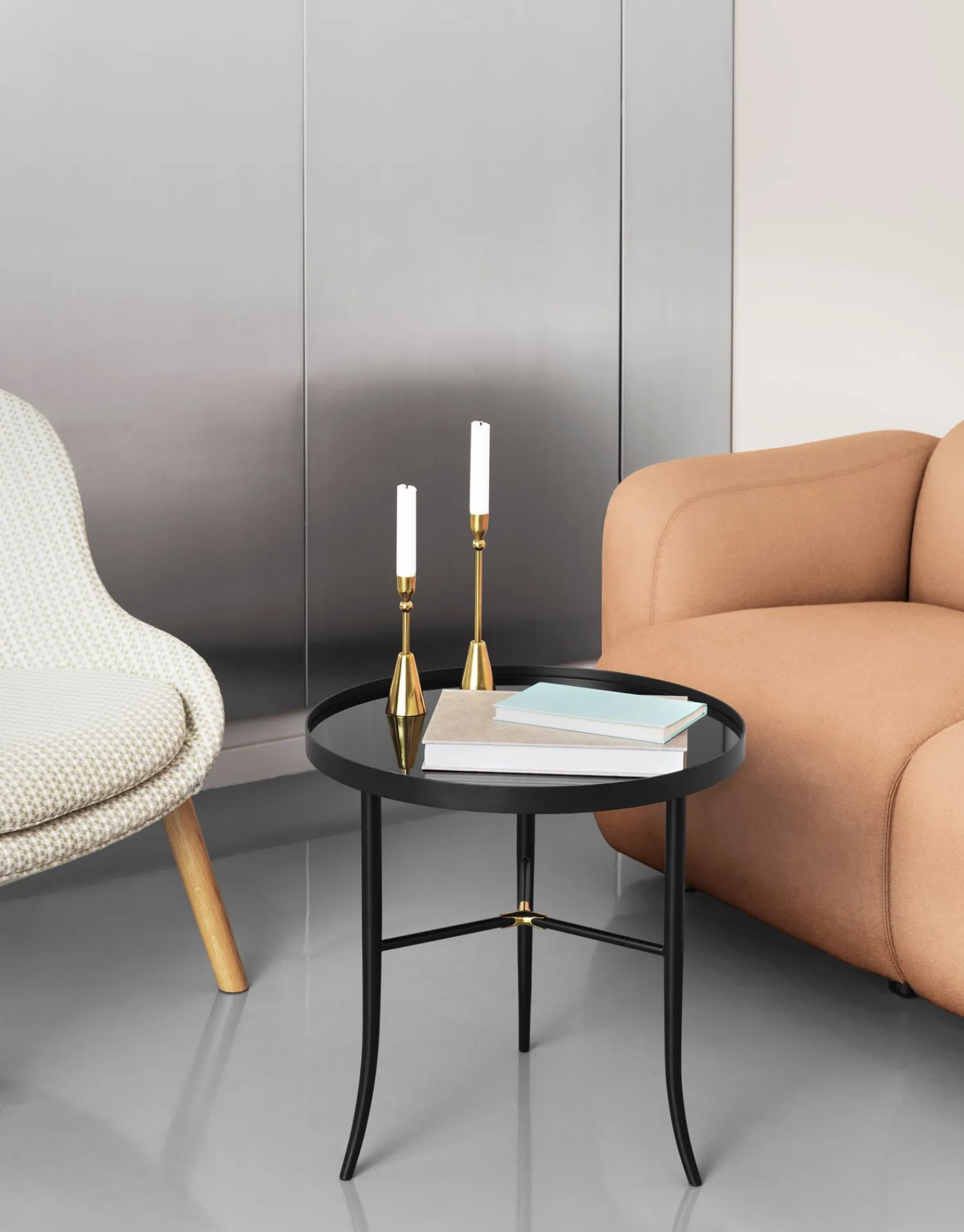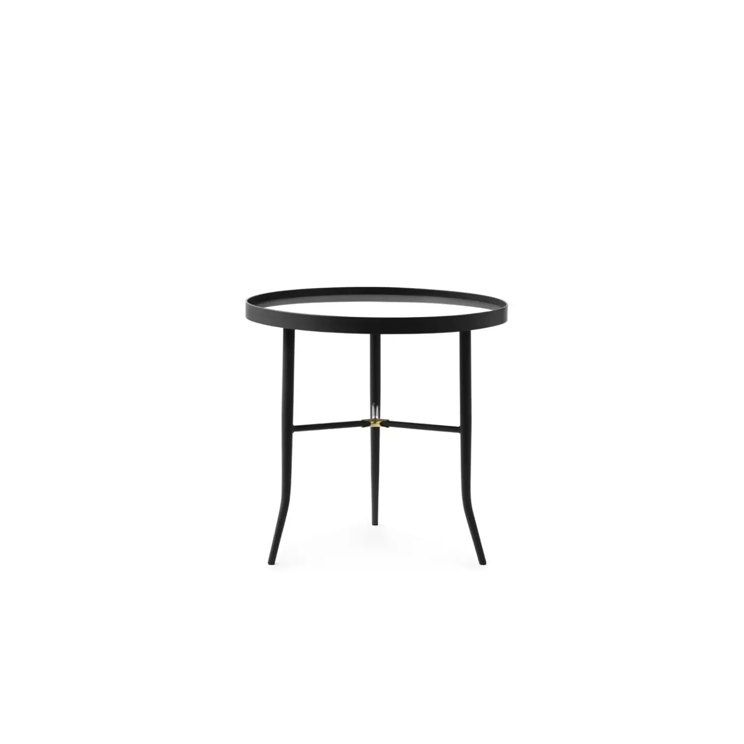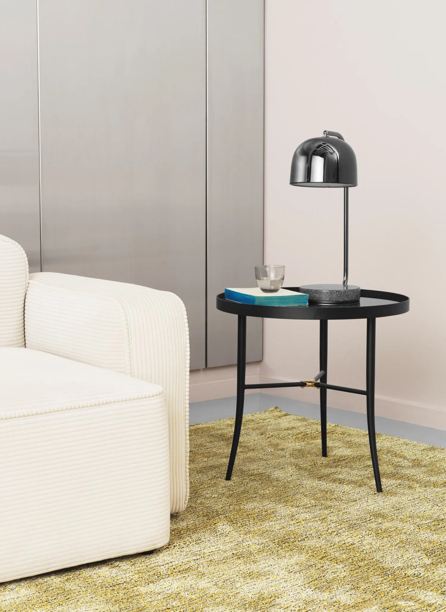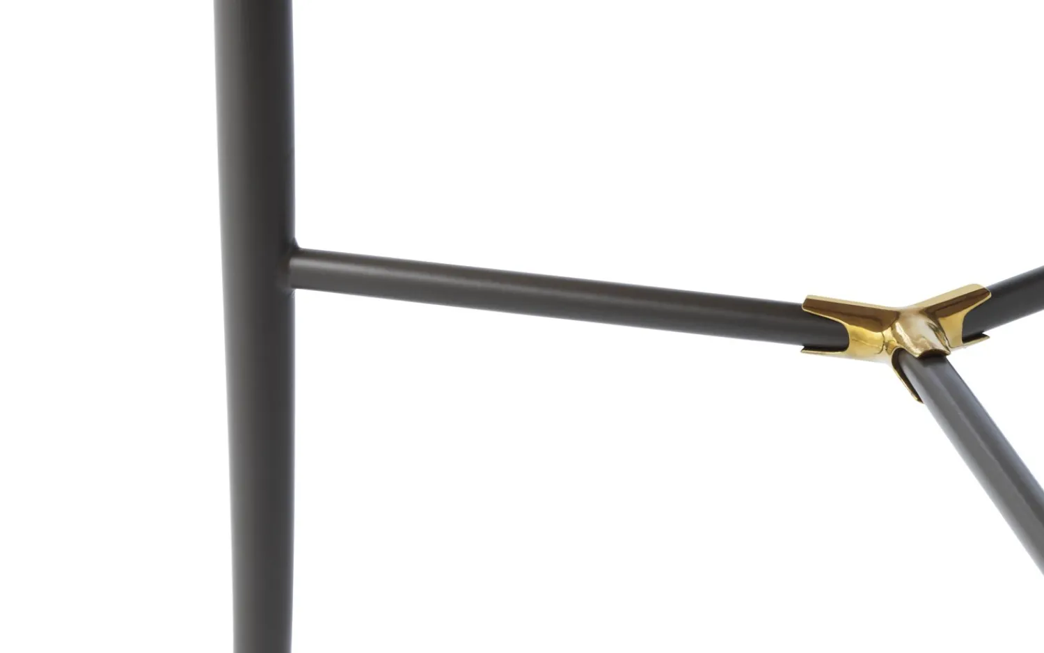Pulverlakeret stålramme forbundet med en messingbelagt stål-connector. Den farvede glasplade ligger oven på stålfoden og indrammes af en stålkant.