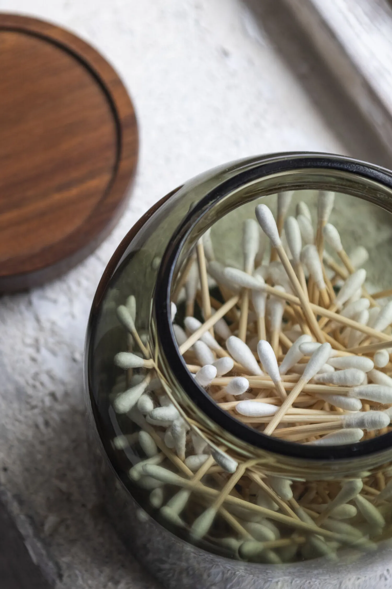 Den lille LUNA-krukke i dybt grønt glas kombinerer funktionalitet og æstetik i et tidløst design. Den organiske, buttede form og låget i mørkolieret akacietræ giver et elegant udtryk, mens silikoneringen sikrer en lufttæt lukning – perfekt til opbevaring af madvarer som pasta, rosiner og nødder. Dens størrelse gør den også ideel til badeværelset til vatrondeller, vatpinde eller håraccessories.Glassets grønne farve skaber en let transparens og et blødt og dæmpet look. Kombinér med andre størrelser og farver i LUNA-serien for et sammenhængende eller legende look.