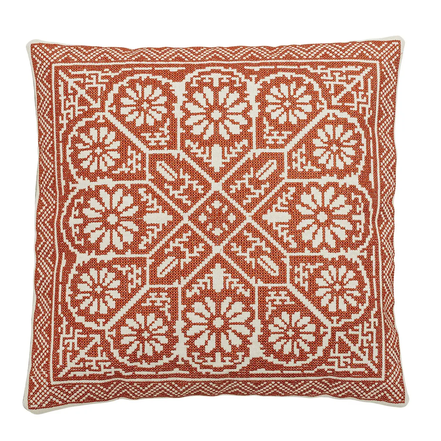 Denne håndlavede bomuldspude på 40 x 40 cm bringer et smukt, symmetrisk mønster ind i dit hjem. Den røde Madita-pude er fremstillet i 100% bomuld med en blød polyesterfyld.