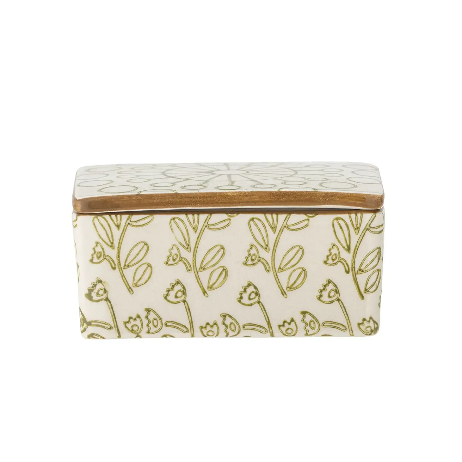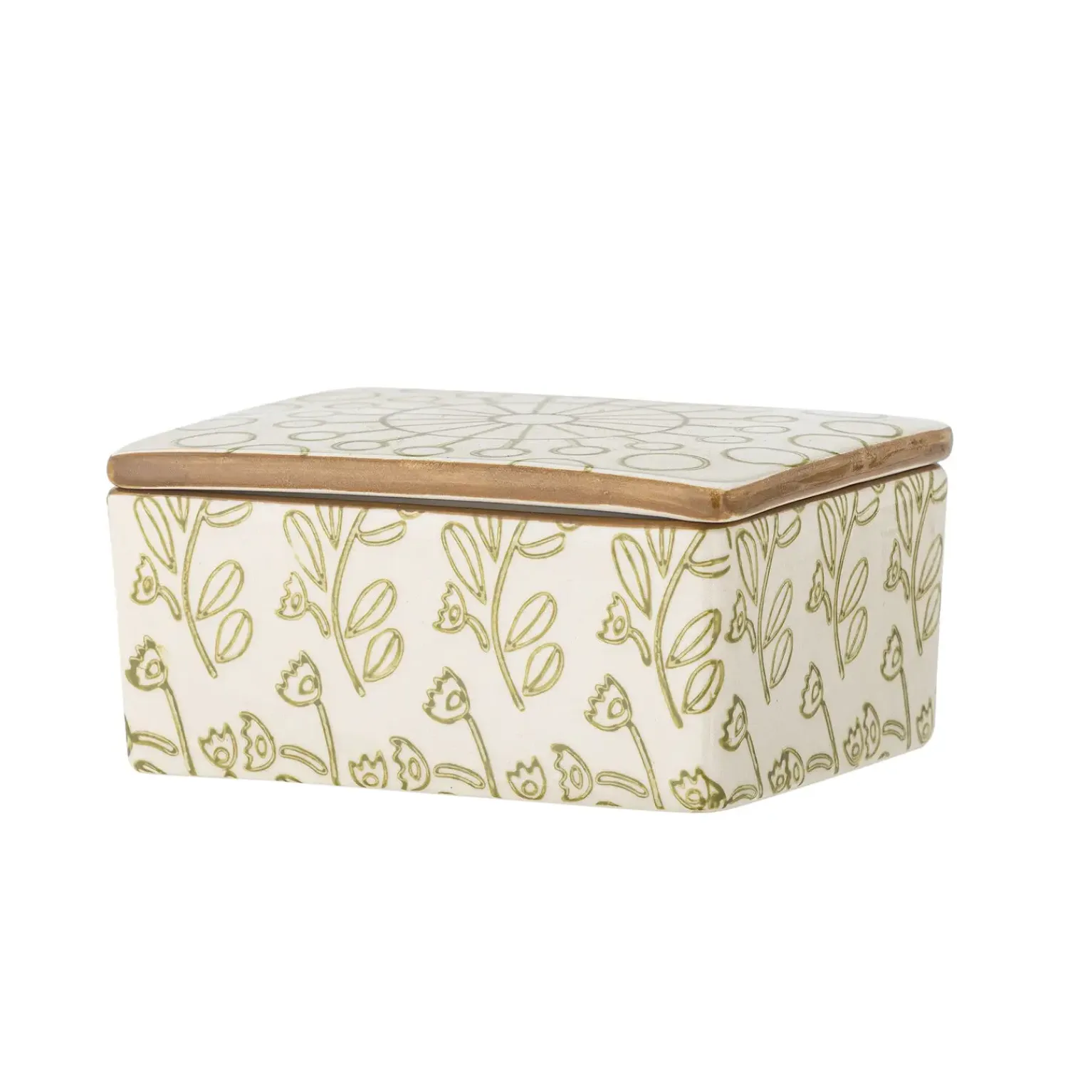 De grønne blomsterdetaljer er omhyggeligt håndmalet på den hvide baggrund, og den brune kant på låget skaber en fin kontrast. Hver boks er særpræget, og farveintensiteten kan variere, hvilket giver dit køkken et personligt præg.