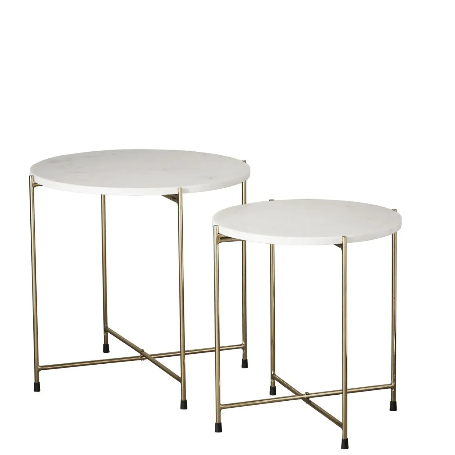 Runde Marmilla sideborde af metal med hvide marmor bordplader og gulddetaljer. Bordene er helt perfekte at bruge samlet som sofaborde eller sætte forskellige som sideborde. Bordene er utrolig praktiske og nemme at slå sammen og flyyte med. Marmor er en natursten, så mønsteret på bordpladen vil variere fra produkt til produkt, dit bord fra Lene Bjerre vil derfor få sit helt eget udtryk. Bordene kommer ii to størrelser, der kan kombineres eller bruges hver for sig.