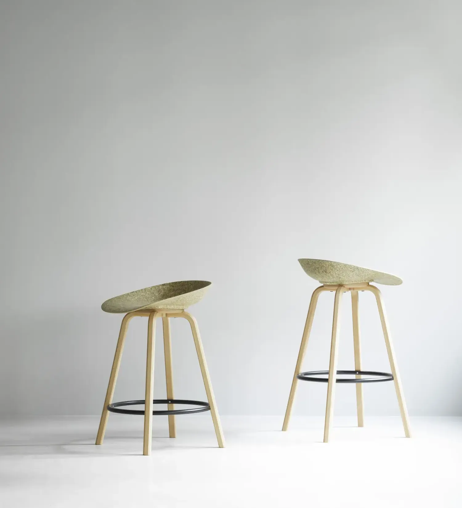 Barstol med skal i 75% hampfibre og cremehvid farve. Bøgestellet og den hvide fodstøtte i stål giver et sammenhængende udtryk. Stolen passer til forskellige indretningsstile.