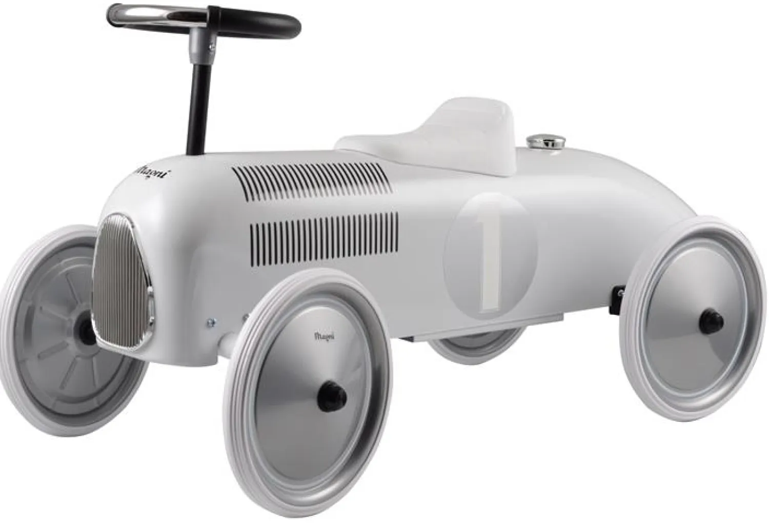 Magni – Gåbil Classic Racer i metal, hvid forener retro charme med solid kvalitet til barnets legestund. Denne gåbil tilbyder de mindste en underholdende og sikker køretur, der fremmer aktiv leg og udforskning i sikre rammer.