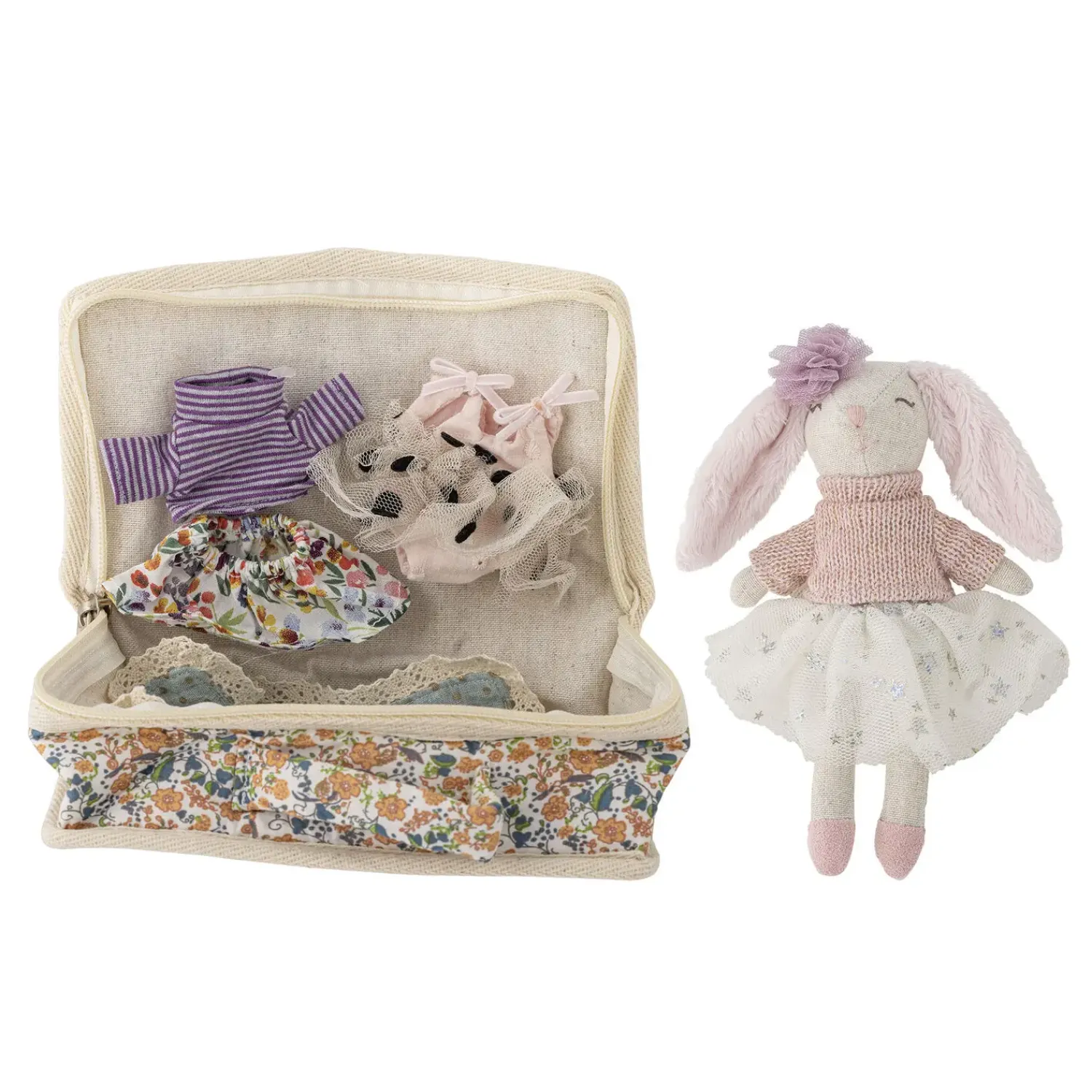 Denne bløde dukke fra Bloomingville måler 15,5 cm i længden, 4 cm i højden og 10 cm i bredden – dimensioner, der gør den nem at håndtere for små børn. Dukken er sikkerhedstestet og godkendt til børn fra 0 måneder.