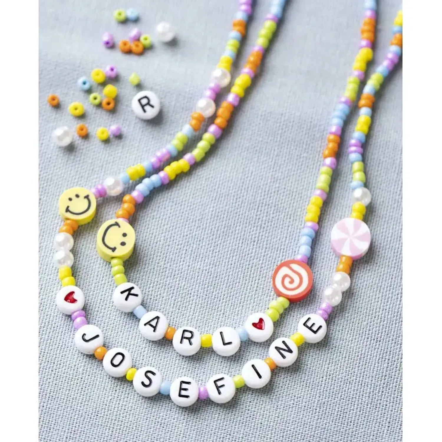 Indhold: Ferskvandsperler, motivperler, bogstavperler, rocaiperler, elastiksnor og smykkenål