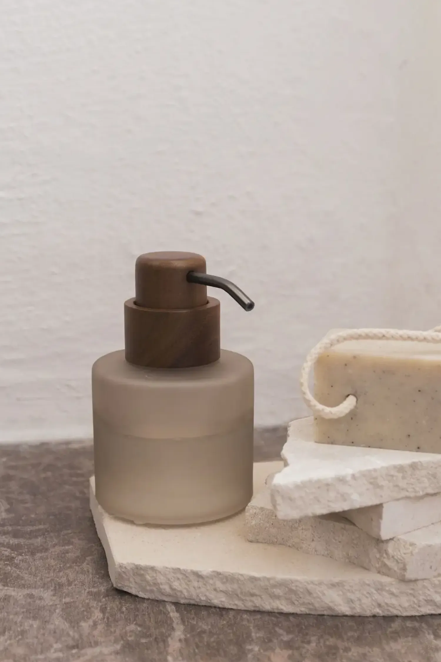 Opgrader badeværelset med MODEST-sæbedispenseren fra Mette Ditmer i den diskrete kitfarve. Denne lave dispenser er designet i glas med et mat look og en træpumpe, der tilføjer et touch af moderne minimalisme til din indretning. Pumpen er behandlet med mat lak for at sikre holdbarhed og er designet med bløde, runde kanter for et æstetisk og indbydende udtryk. Den skinnende gunmetal-tud doserer nemt og elegant sæben, mens kombinationen af materialerne fremhæver dispenserens visuelle æstetik og praktiske funktionalitet.