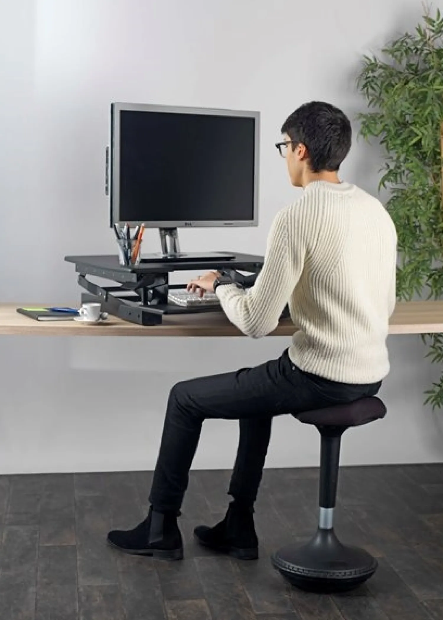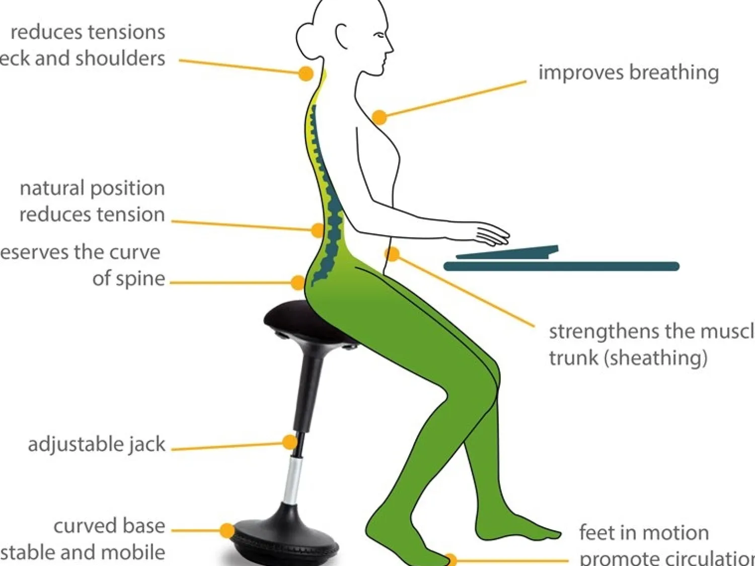 MOOVE Seat har en stor bevægelses frihed og kan justeres i højden fra 52 – 81 cm ved hjælp af gascylinderne. Den runde fod gør at man altid kan sidde korrekt, og ungå skader i ryg, skulder, nakke og arme.