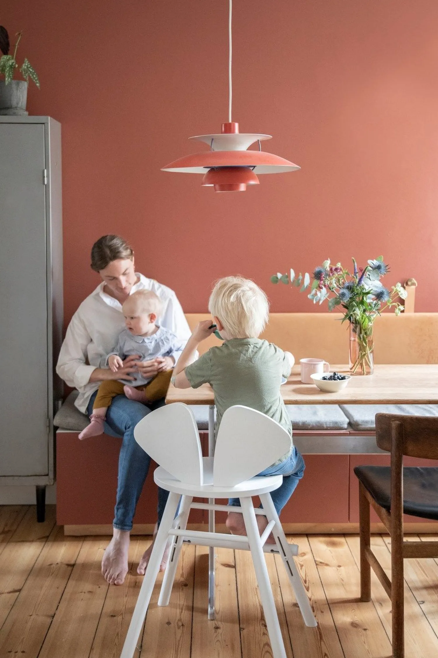 Den høje stol tilbyder en tryg og robust siddeplads, både under alle hovedmåltiderne og andre aktiviteter i løbet af dagen.