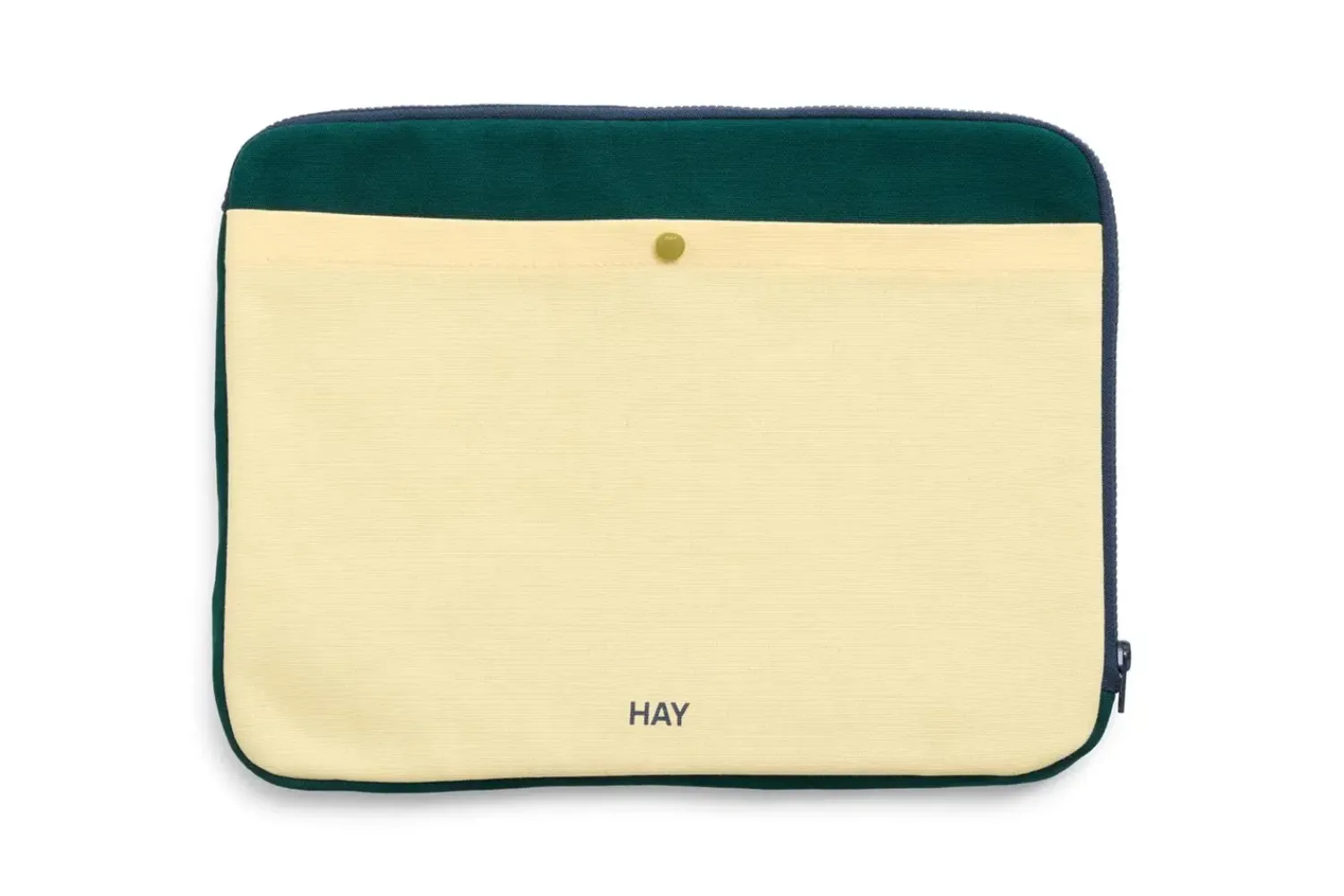 Dette laptop-cover fra Hay kombinerer en blød gul farve med en mørkegrøn kant i et todelt design. Det er fremstillet af 100% økologisk bomuld, som giver din bærbare computer sikker beskyttelse i hverdagen.