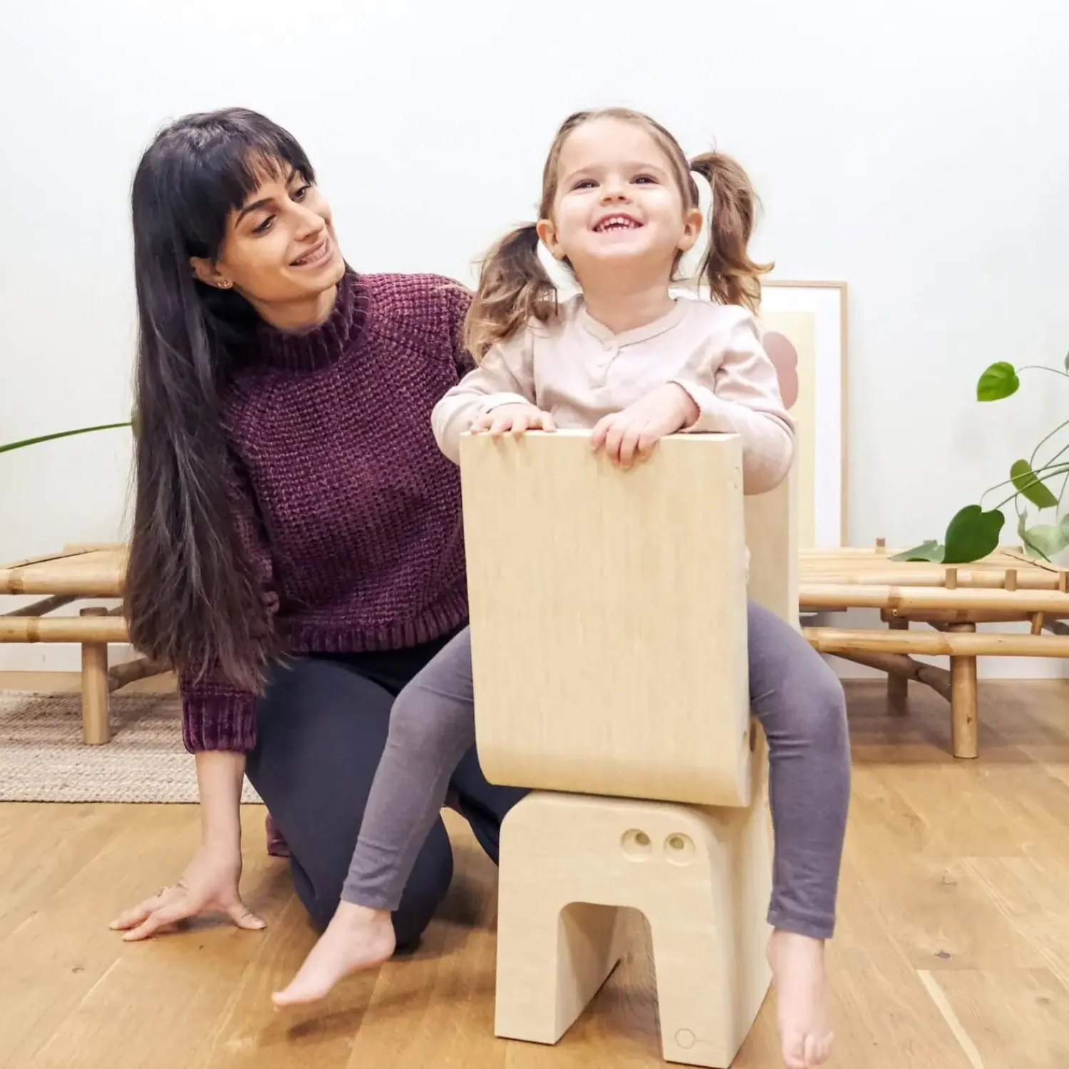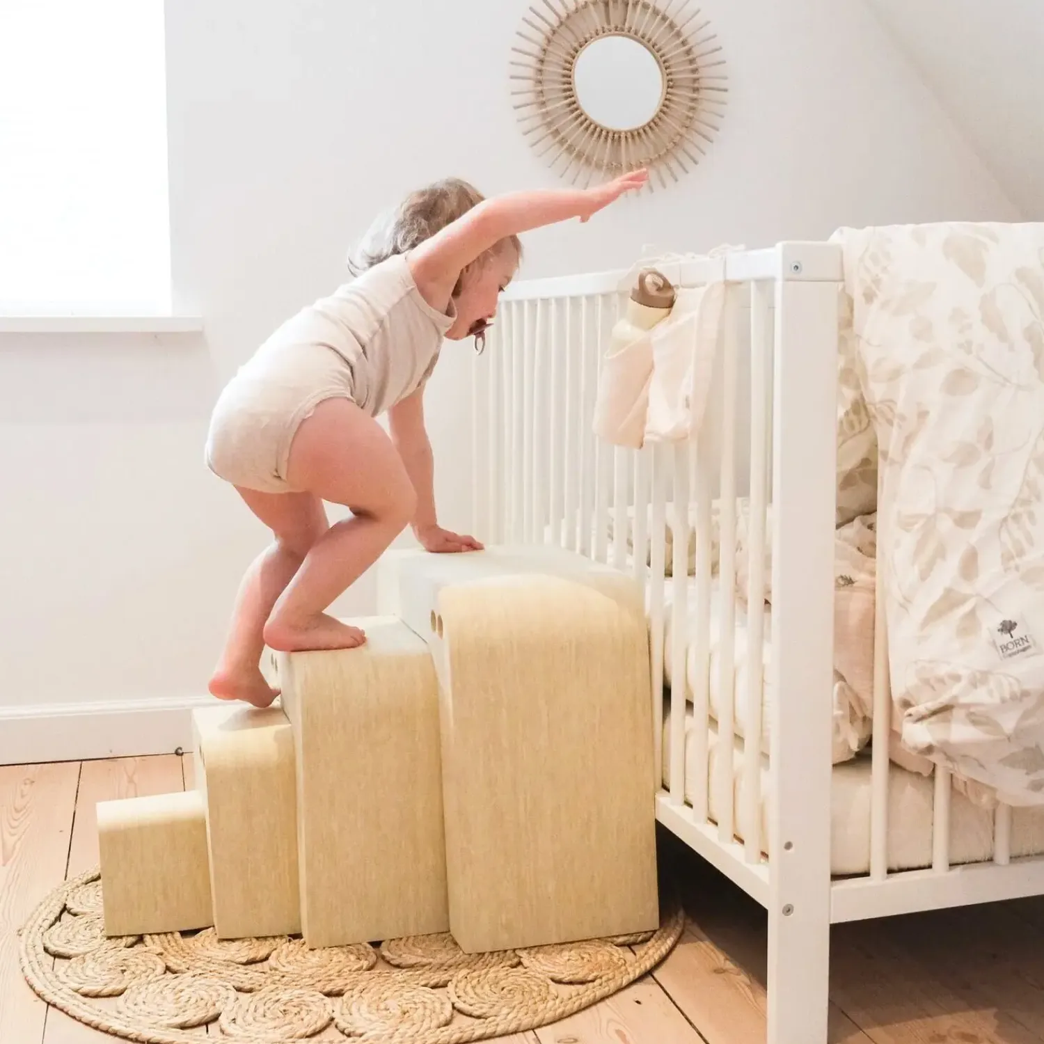 To af delene vipper, mens de to andre står fast, og det gør trappe- og skammelfunktionen til en sjov og udfordrende leg for barnet, der samtidig skal forholde sig til ændringen i bredden på trinene for hvert skridt.