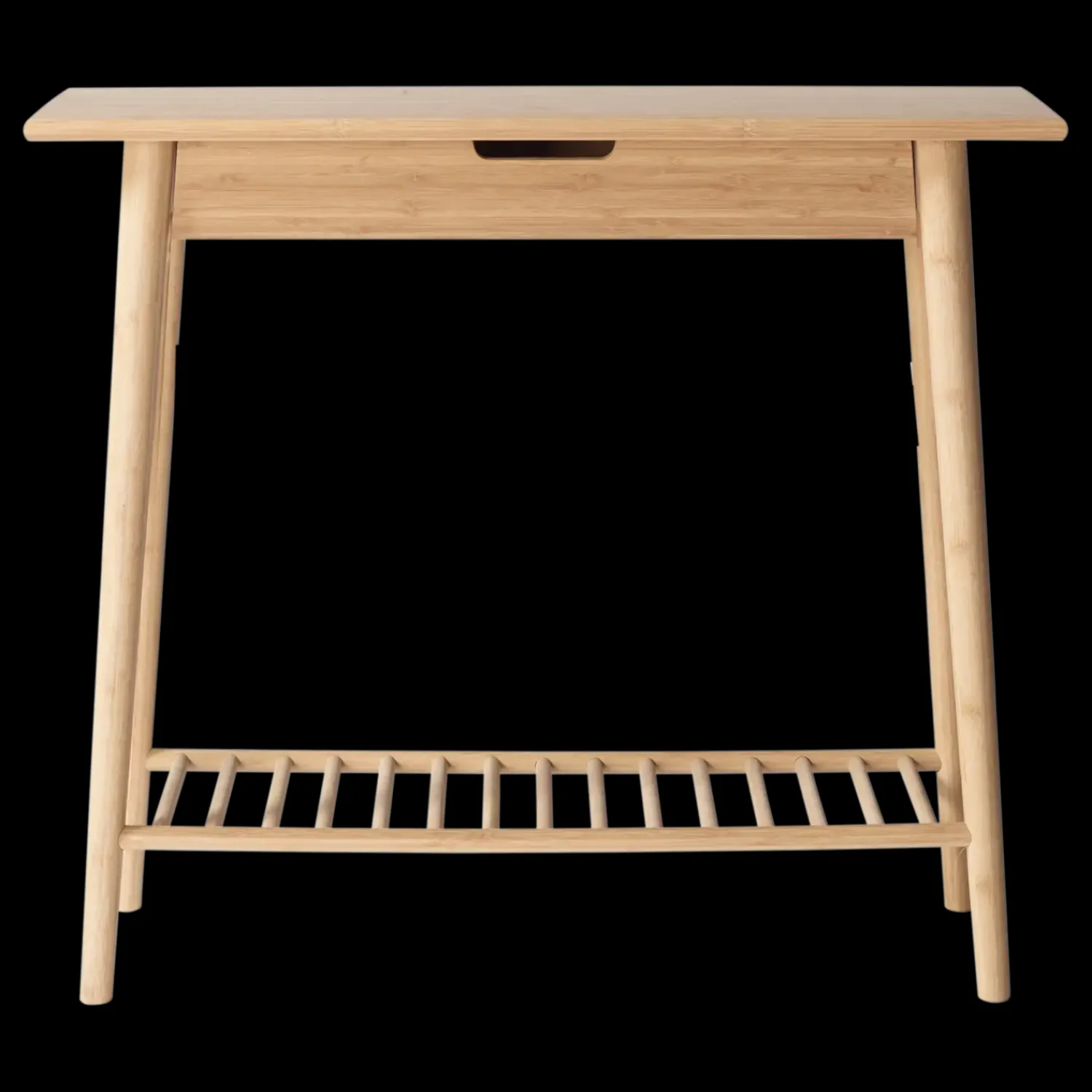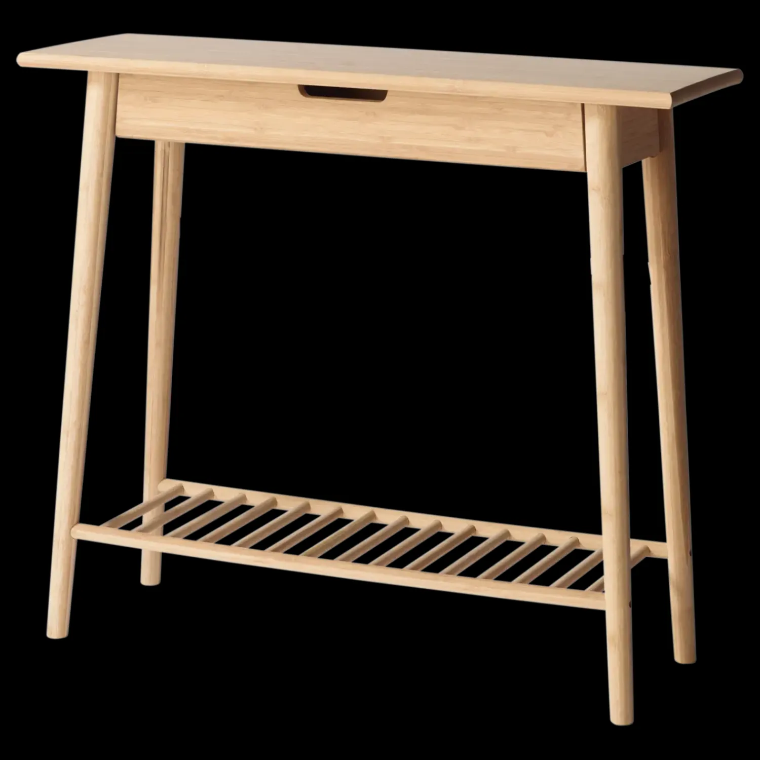 Noble konsolbordet har en slank profil og flere opbevaringsmuligheder. Udtræksskuffen giver plads til småting, mens lamelhylden nederst tilbyder ekstra plads til sko eller andre genstande. Konstruktionen i vertikalt karboniseret bambus giver bordet en karakteristisk overflade og farve.