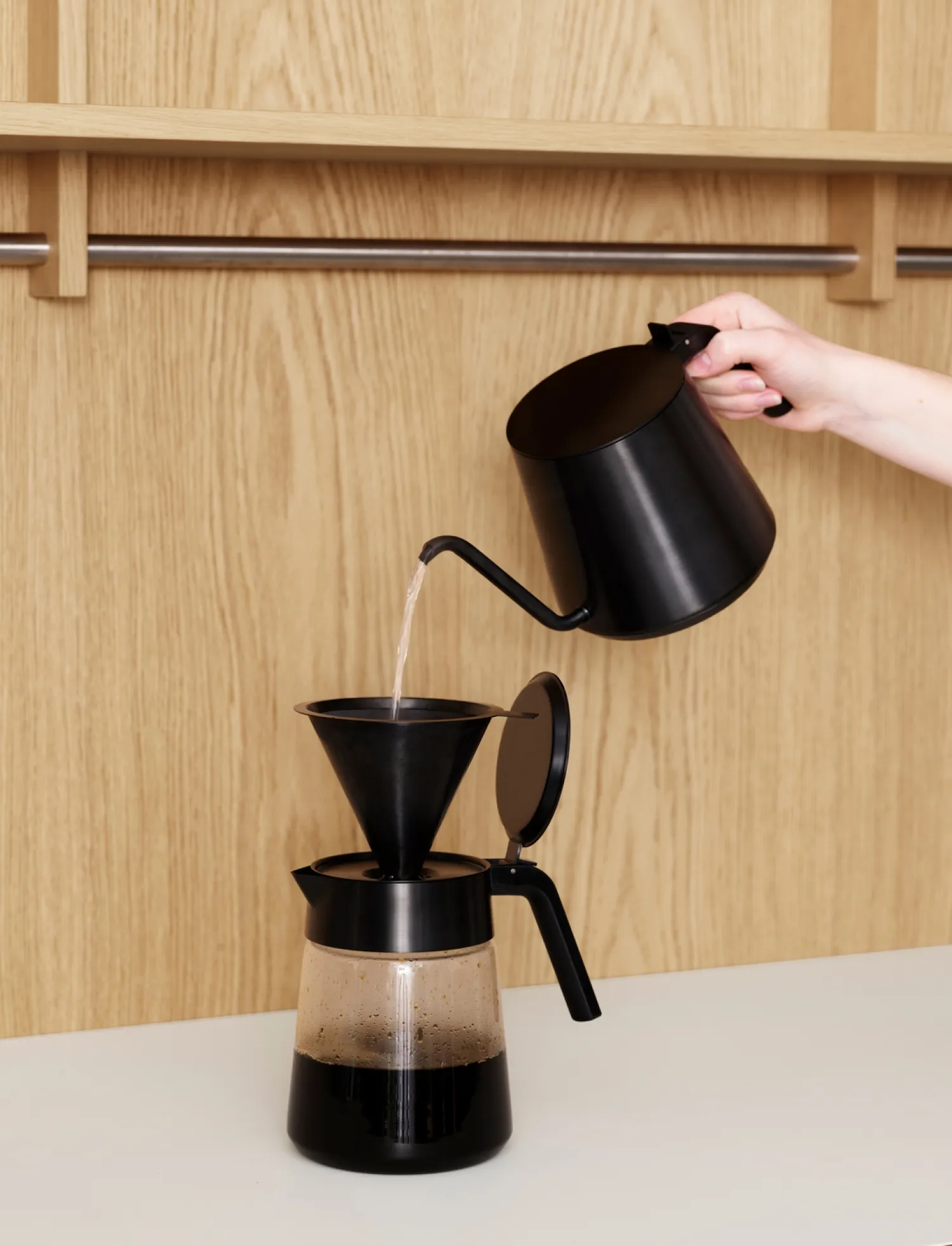 Gooseneck kedlen med sin lange slanke hals er dekorativ at se på og funktionelt udviklet til at give den bedste smagsoplevelse, når der brygges pour over kaffe. Halsen giver bedre kontrol over vandet, du hælder på dine bønner, og den gør det lettere at hælde i cirkulære bevægelser, der er essentielt for bryggemetoden. Kedlen kan bruges på alle varmekilder, inkl. induktion. Gooseneck kedlen er en del af kaffeserien Nohr og kan med fordel bruges sammen med Nohr serveringskande og Nohr kaffetragt for en fuldendt pour over kaffeoplevelse. Nohr er designet af Søren Refsgaard med et ønske om at skabe en serie for kaffeentusiaster, der ønsker den ultimative smagsoplevelse. At brygge god kaffe er et håndværk, der kræver tid og nærvær – det understreges af roen og enkeltheden i Nohr-seriens design.