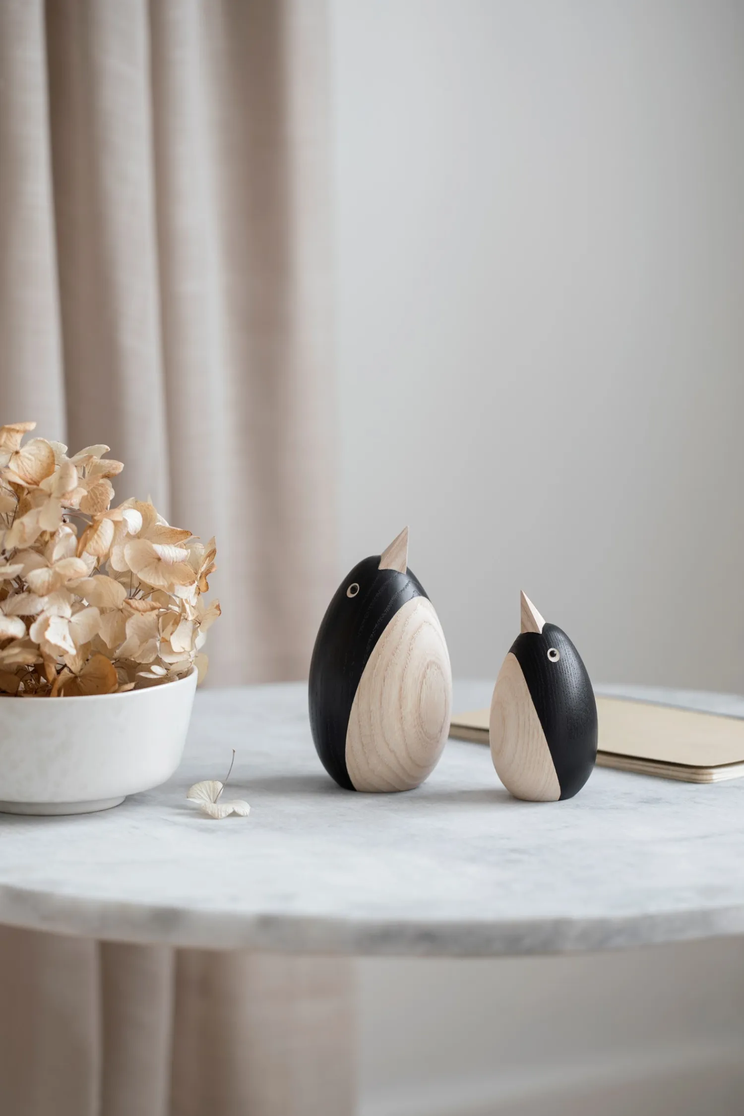 Pingvinen er lavet af massivt asketræ og håndlavet af trædrejere.
