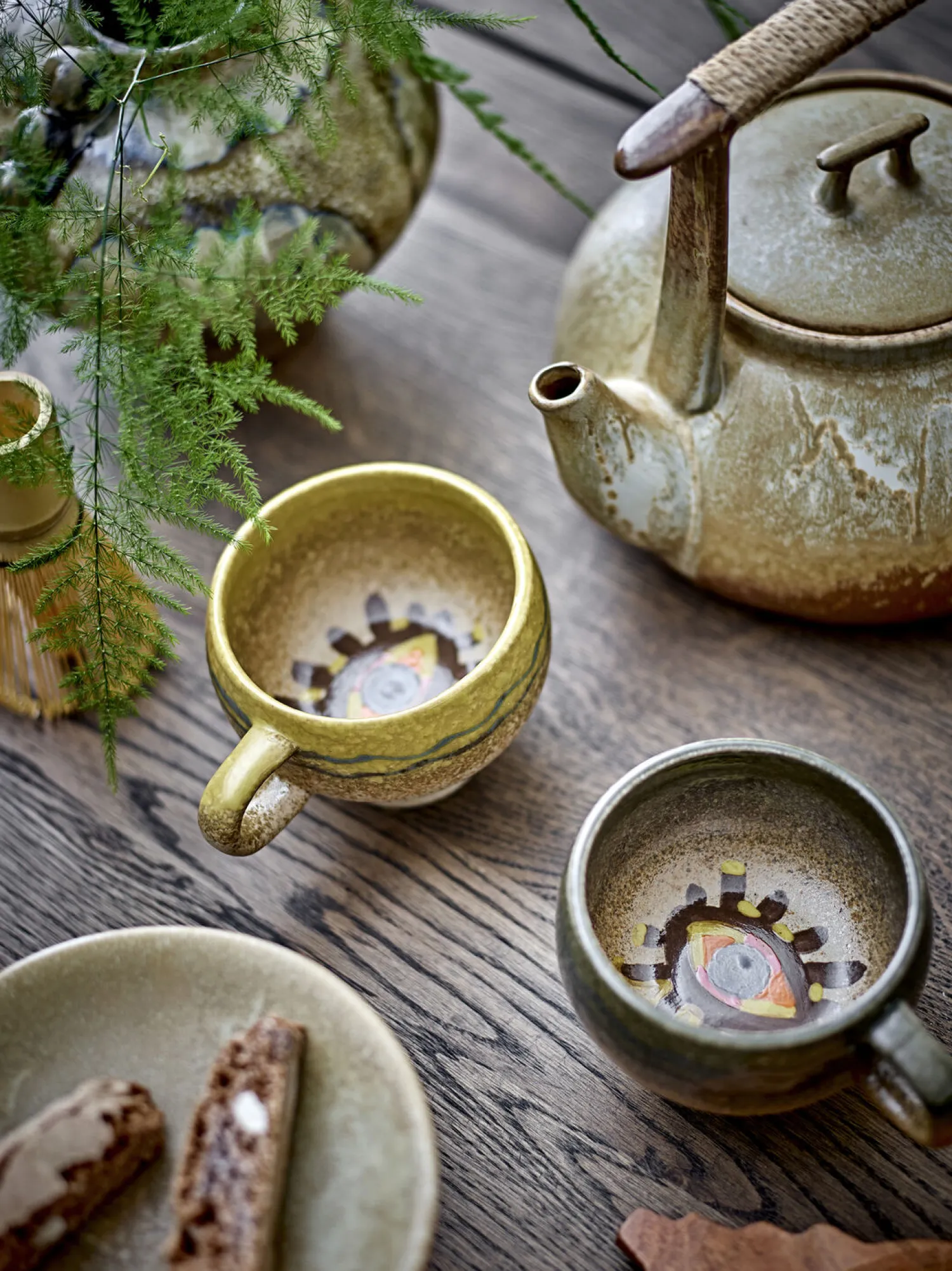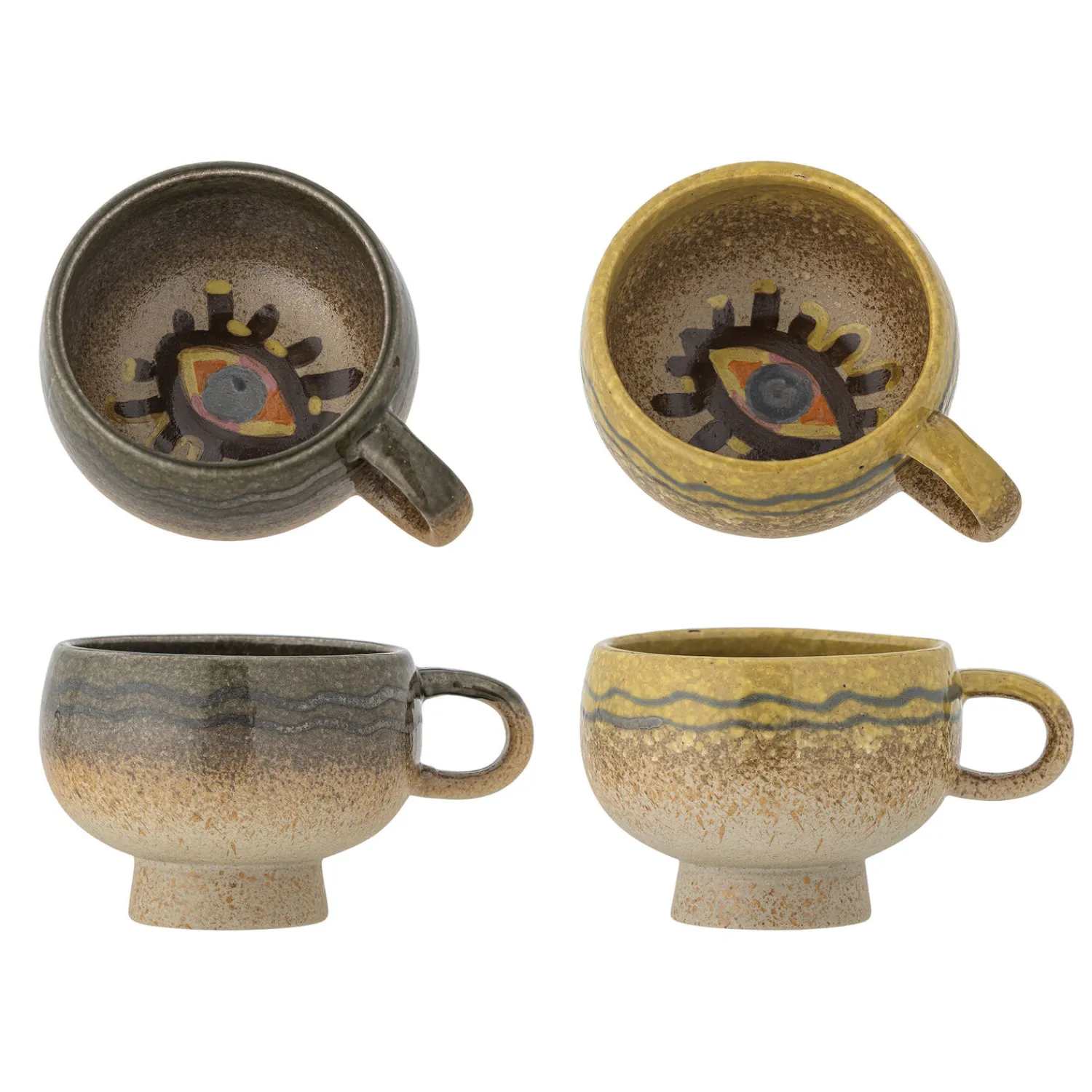 Dette sæt af to håndlavede stentøjskopper byder på en særlig øjendekoration i bunden. Hver kop er håndmalet med reaktiv glasur, som giver unikke farvevariationer i den brune overflade.