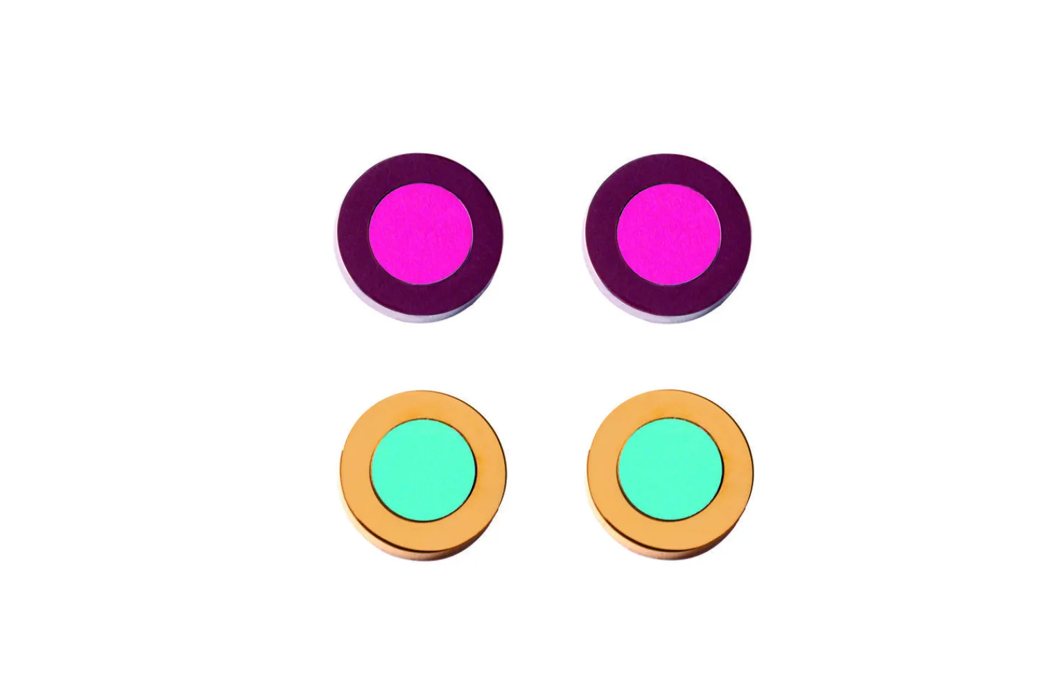 Disse ørestikker er designet til at komplementere vores smykkevedhæng og -bånd, men de står også flot alene. De ydre og indre elementer kan bæres sammen, eller du kan vælge at bære de indre nitter alene for et mere subtilt look. Med deres flade, cirkulære design og levende farver tilføjer de et strejf af personlighed til ethvert outfit. Brug dem til at peppe et hverdagsoutfit op, eller lad dem være det perfekte tilbehør til en festlig lejlighed. De livlige farver gør dem velegnede til både sommer- og vinterlook.