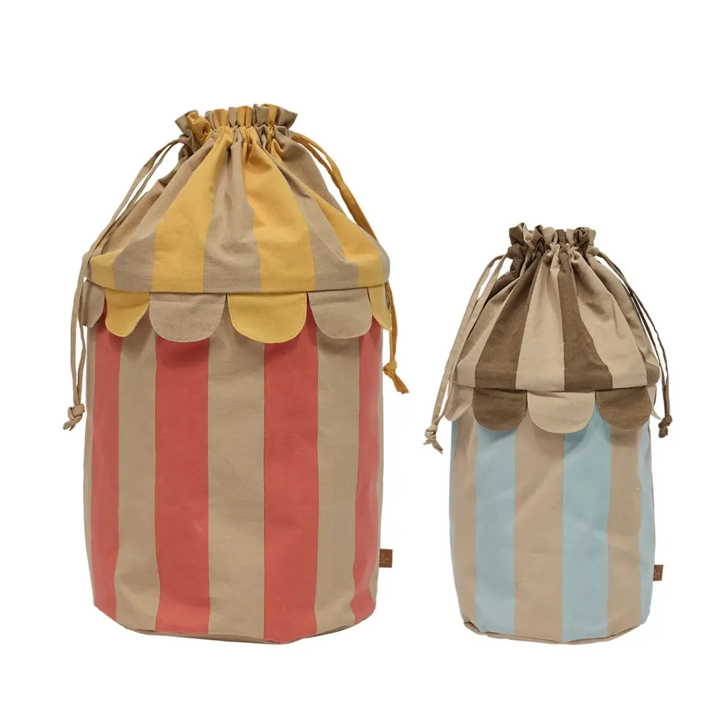 Disse stofopbevaringsposer fra OYOY kombinerer praktisk opbevaring med et karakteristisk stribet design. Du får to forskellige størrelser med bløde låg og praktisk snørelukning, der gør det nemt at organisere dine ting.