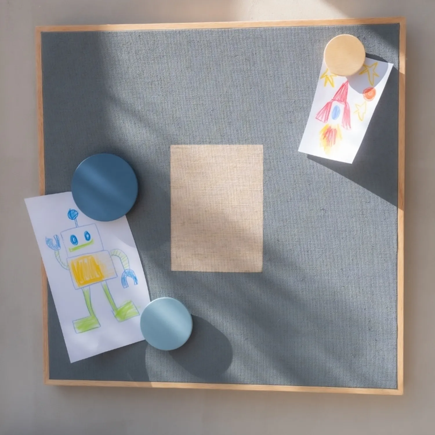 Opslagstavlen og dertilhørende magneter er et kunstværk i sig selv. Lad børnene udstille tegninger, billeder og gode minder på tavlen.