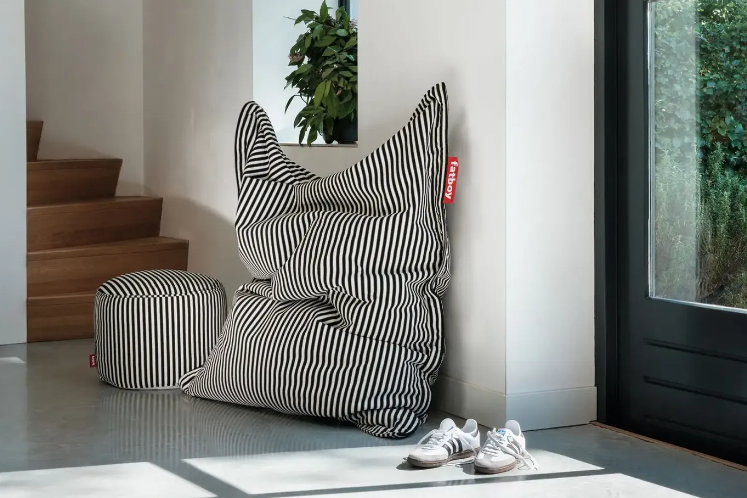 Denne sækkestol fra Fatboy kombinerer komfort med et karakteristisk stribet design i sort og creme. Med sine 155 x 120 cm skaber den en indbydende siddeplads, der nemt kan tilpasses forskellige rum i dit hjem.