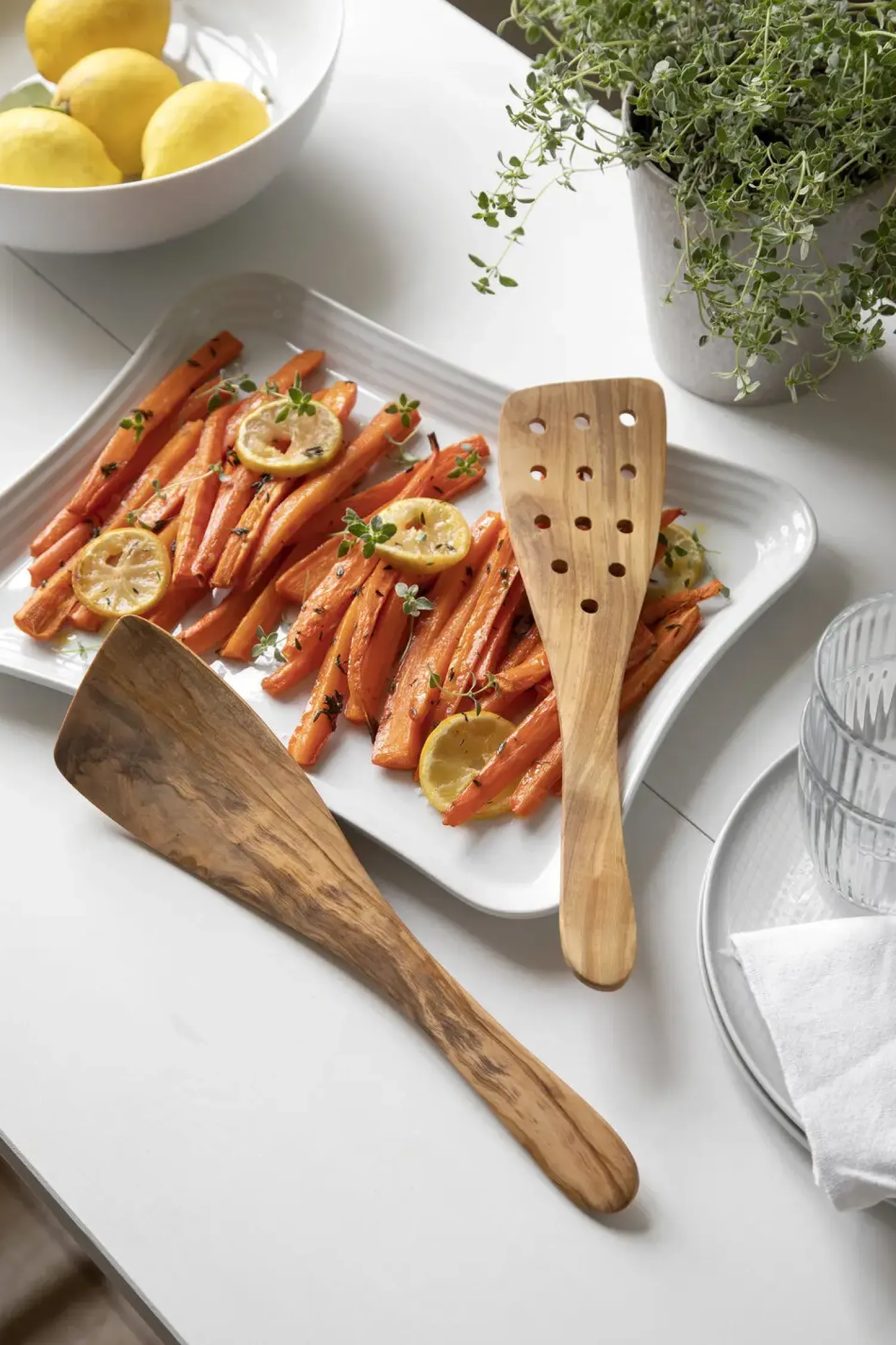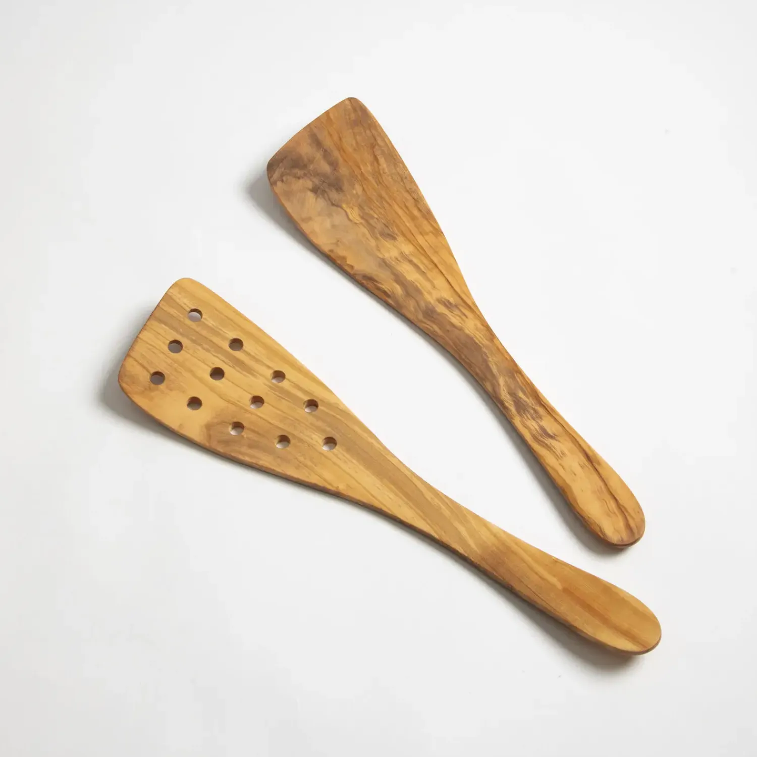 Dette køkkensæt består af to paletter i 100% oliventræ – én flad palet og én med praktiske huller. Oliventræets naturlige egenskaber gør disse redskaber særligt velegnede til daglig madlavning, da de forbliver lugtfri takket være træets smalle porer.