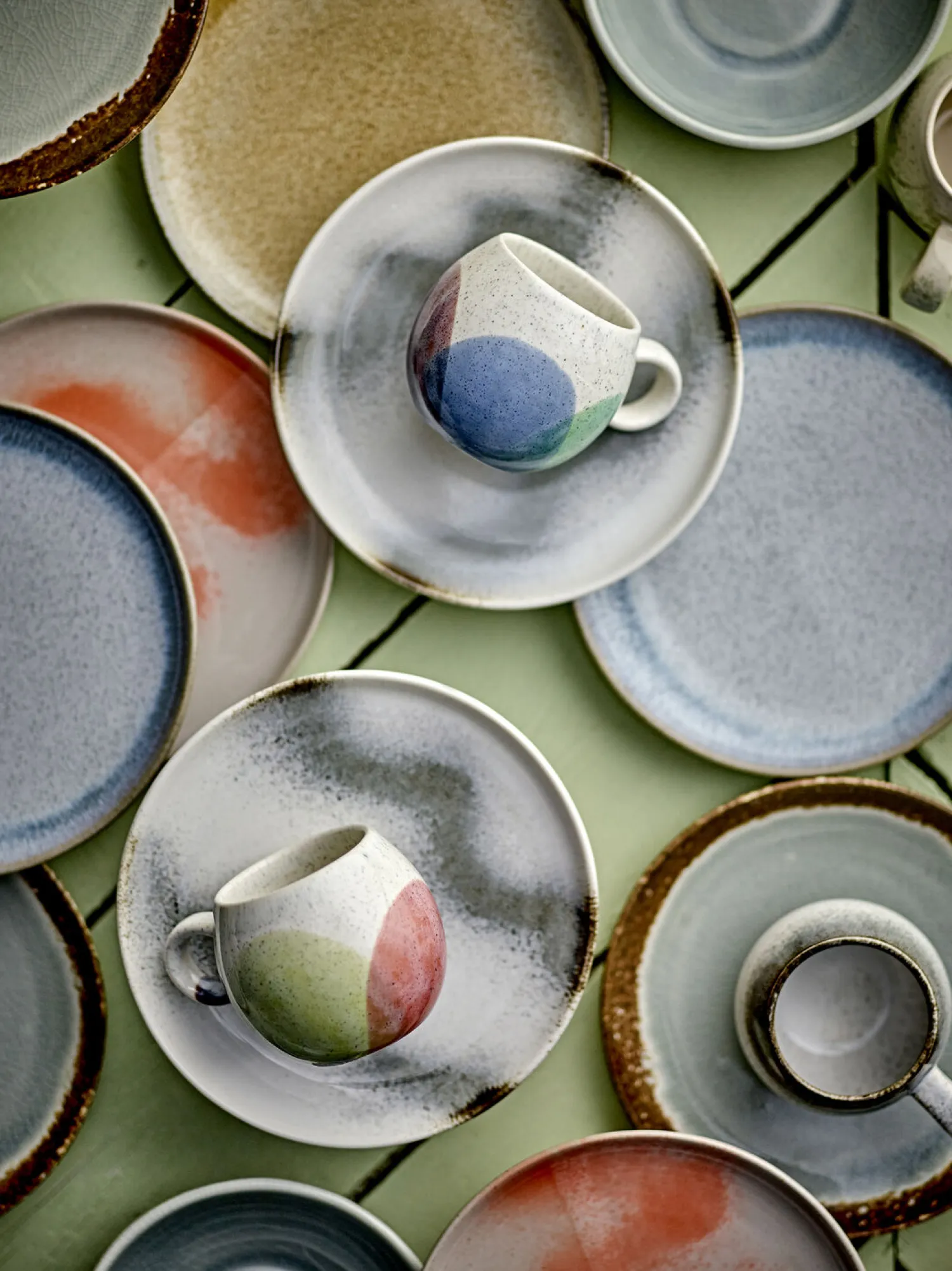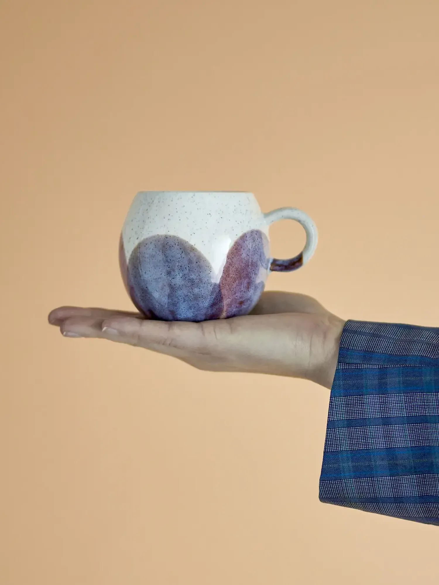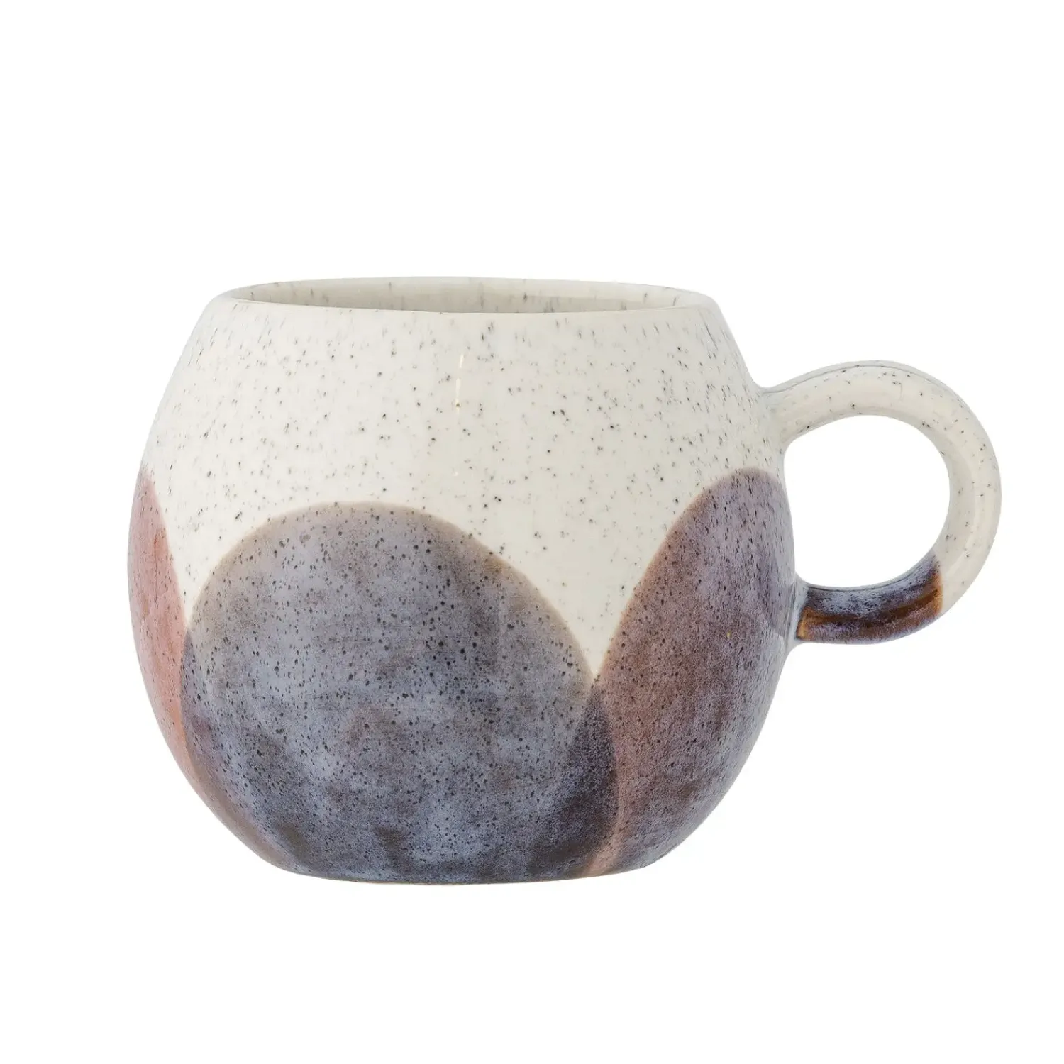Denne fødevaregodkendte kop i stentøj rummer 240 ml og har praktiske mål på 9 cm i diameter og 8 cm i højden. De jordfarvede cirkelmønstre og naturlige glasurvariationer gør hver kop særpræget.