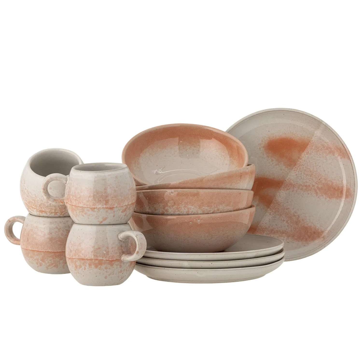 Dette håndlavede morgenmadssæt i stentøj består af 4 kopper (D9 x H8 cm), 4 tallerkener (D20 cm) og 4 skåle (D16,5 x H5 cm). Sættet har en karakteristisk farvegradient fra orange til hvid.