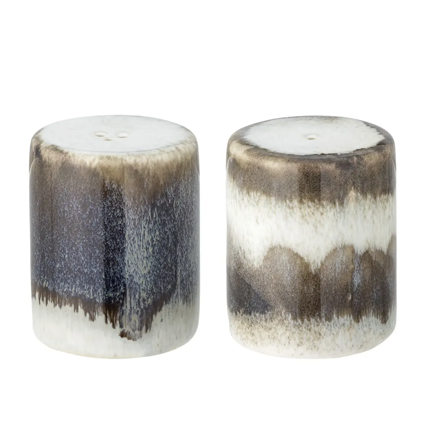 Dette håndlavede salt- og pebersæt i stentøj kombinerer holdbarhed med hverdagsfunktionalitet. De to cylindriske beholdere har en karakteristisk glasering, hvor grå, brune og hvide nuancer mødes i naturlige overgange.