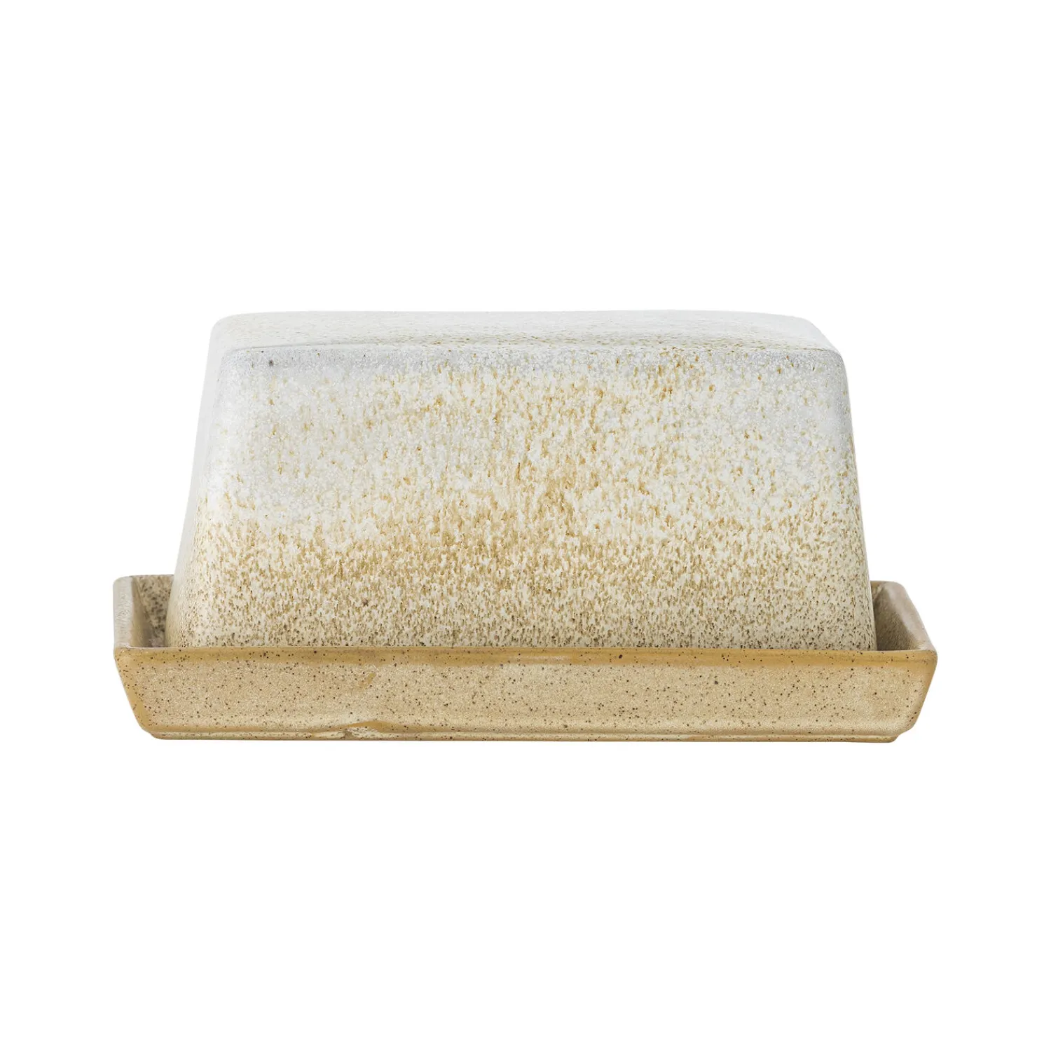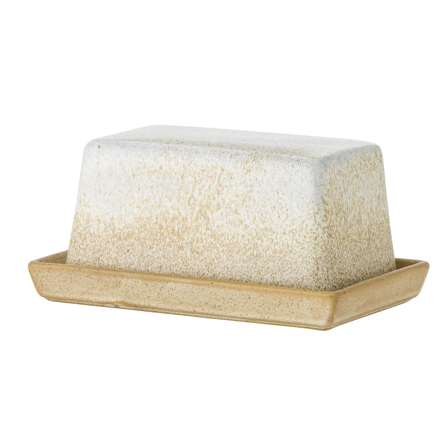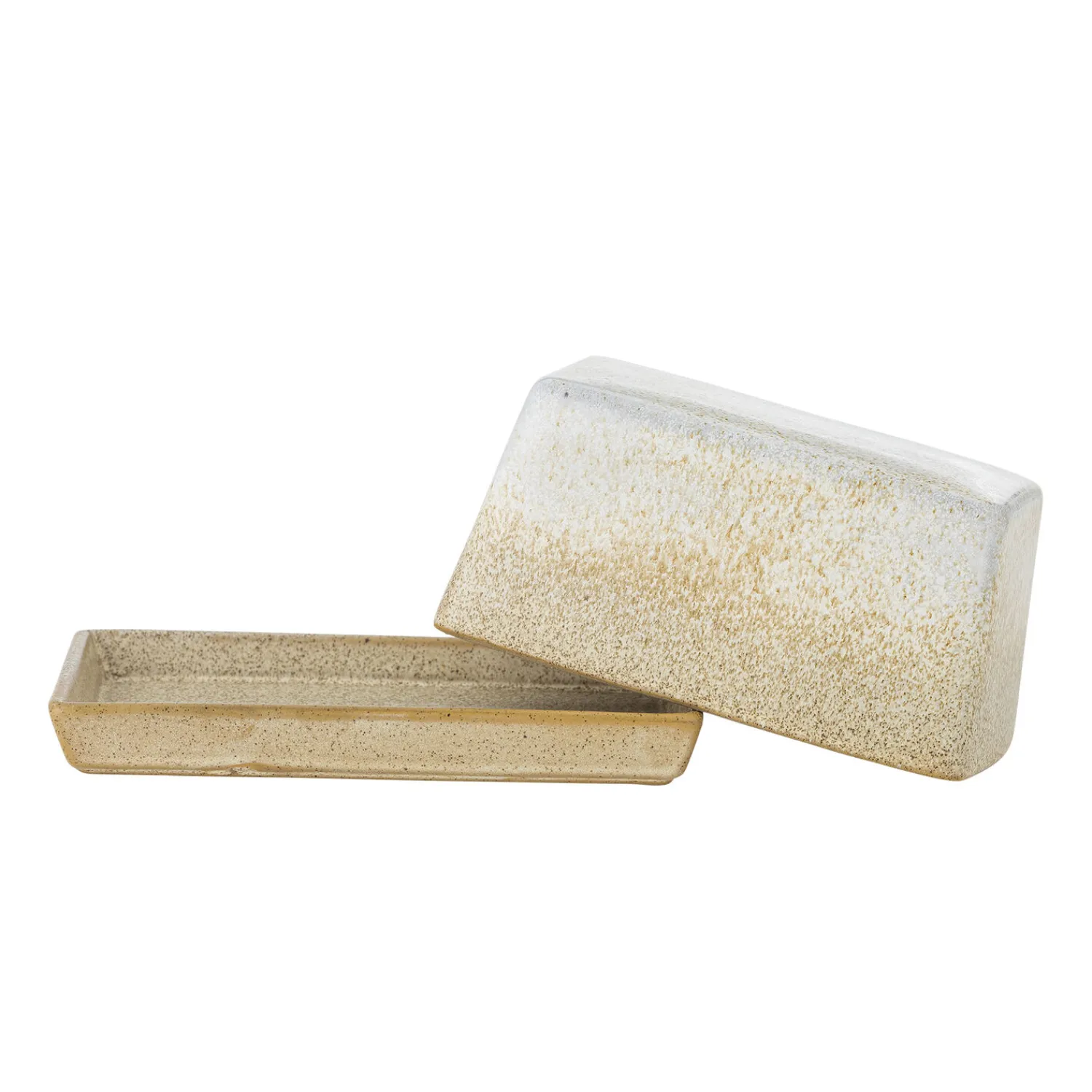 Håndlavet smørboks i stentøj med naturlig farvetone, der forener funktionalitet og håndværk i dit køkken. De omhyggeligt udvalgte materialer sikrer en holdbar opbevaringsløsning til din daglige madlavning.